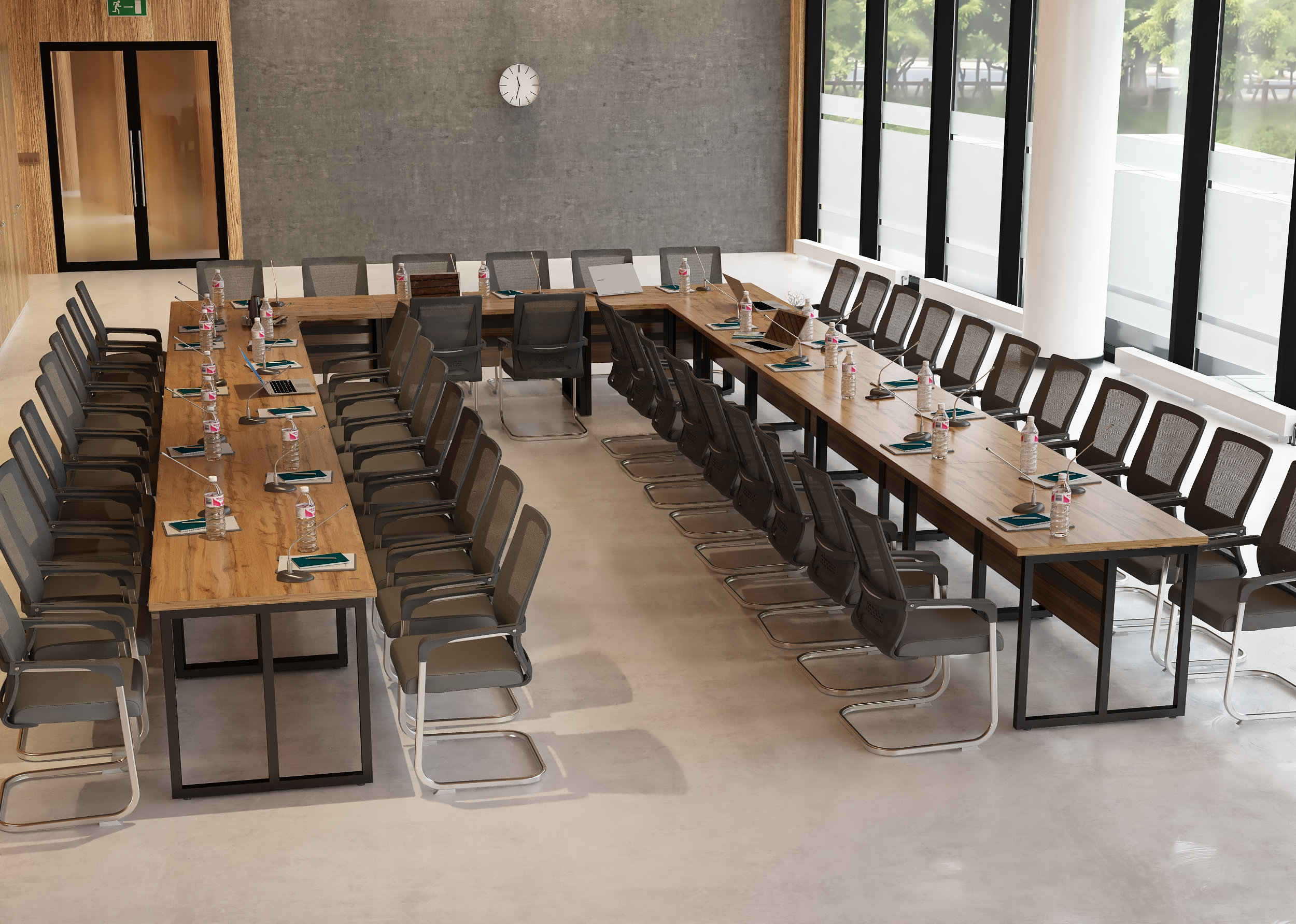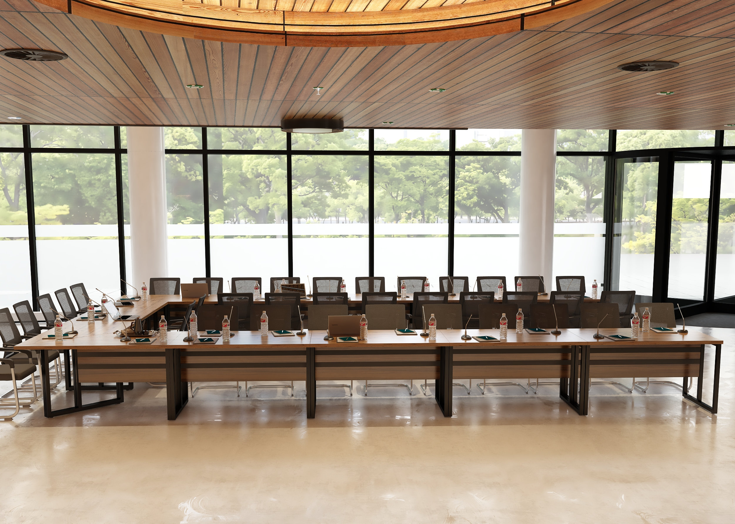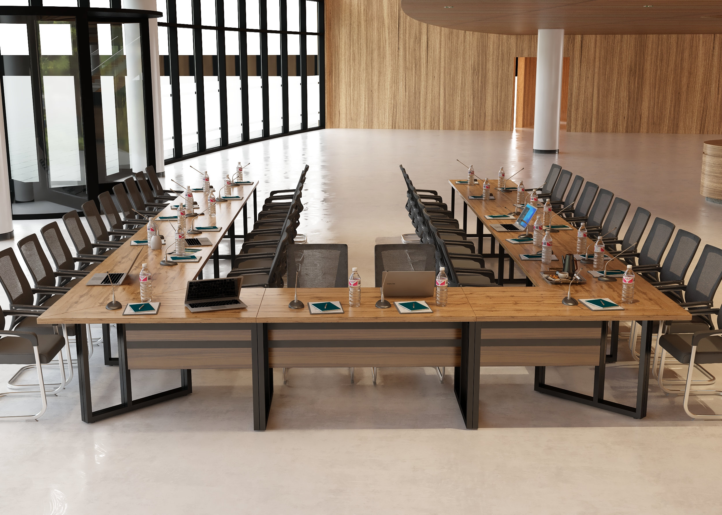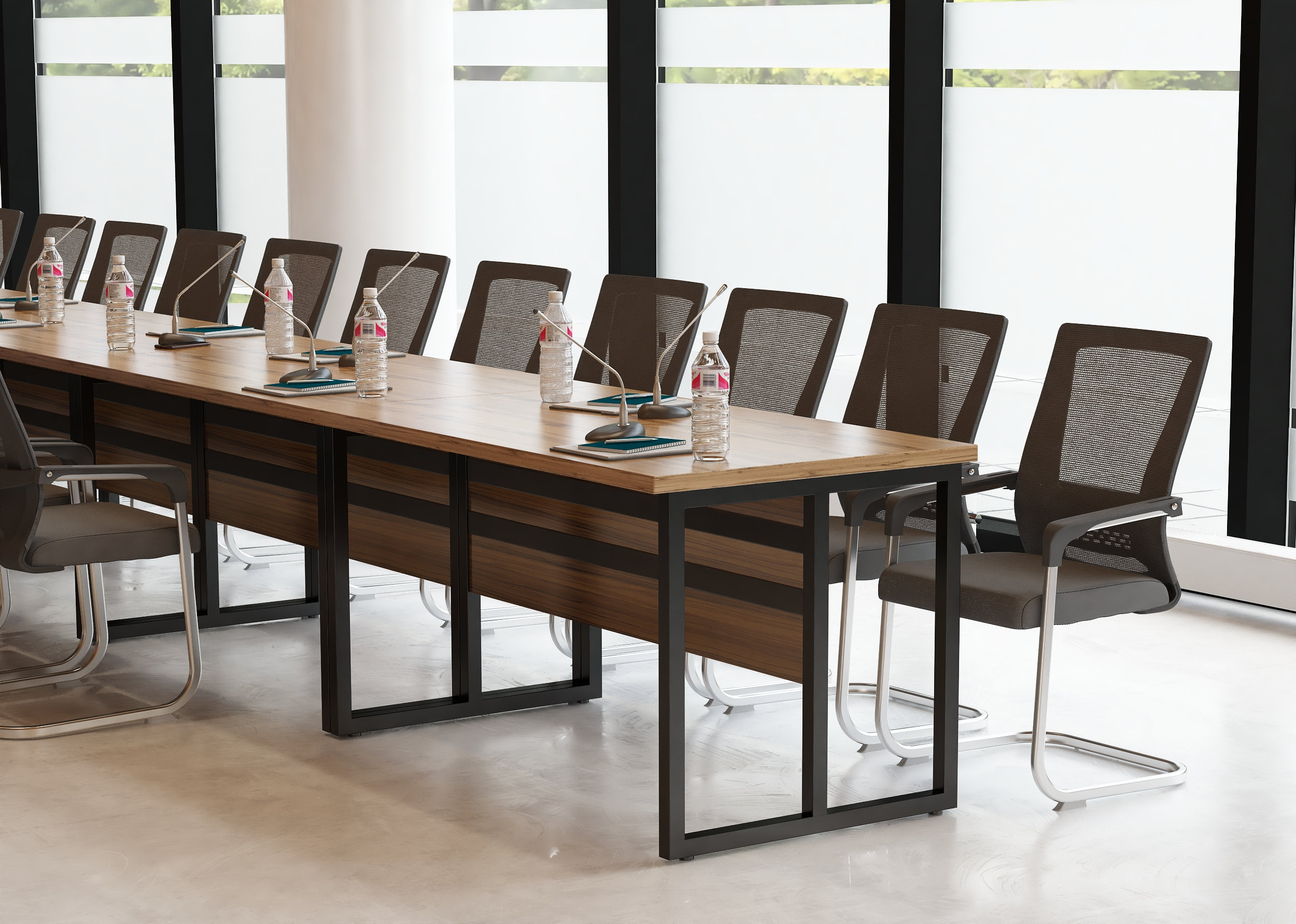 Elegancki stelaż w połączeniu z minimalistyczną bryłą blatu ze ściętymi krawędziami nadaje wnętrzu profesjonalny i prestiżowy charakter, doskonale integrując się z różnymi stylami aranżacji.