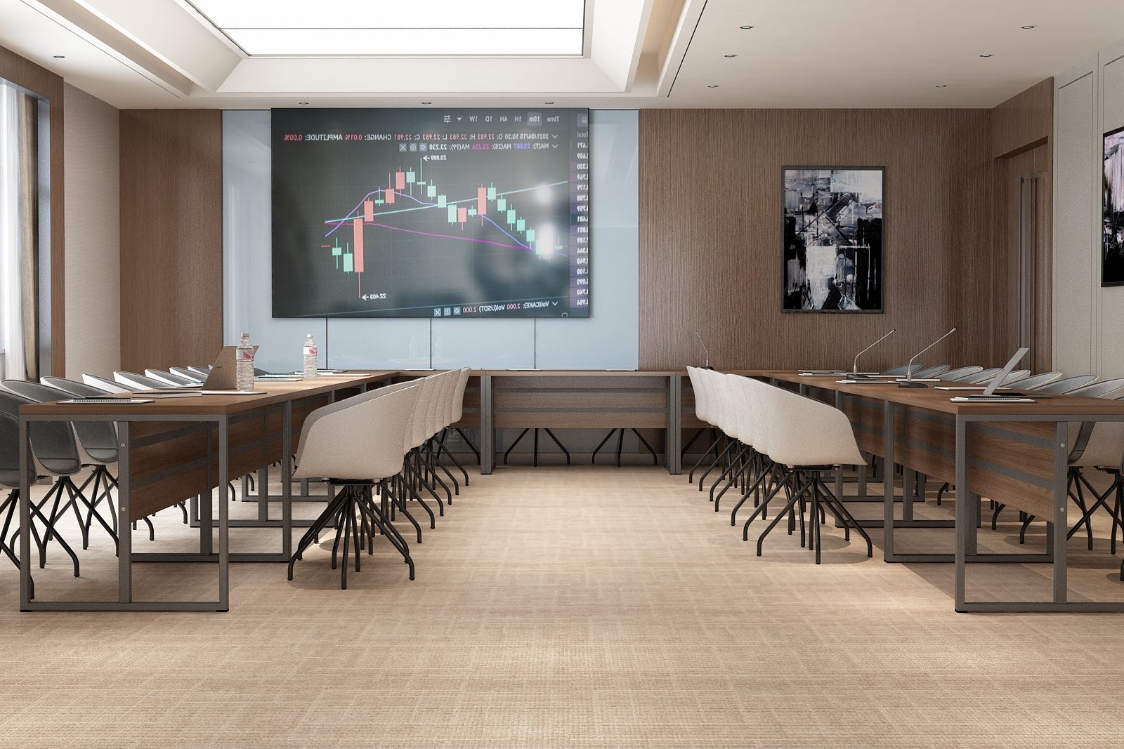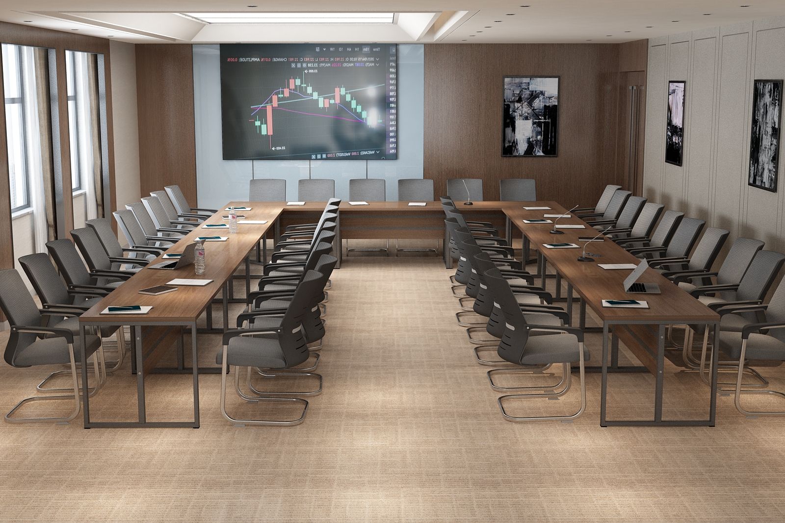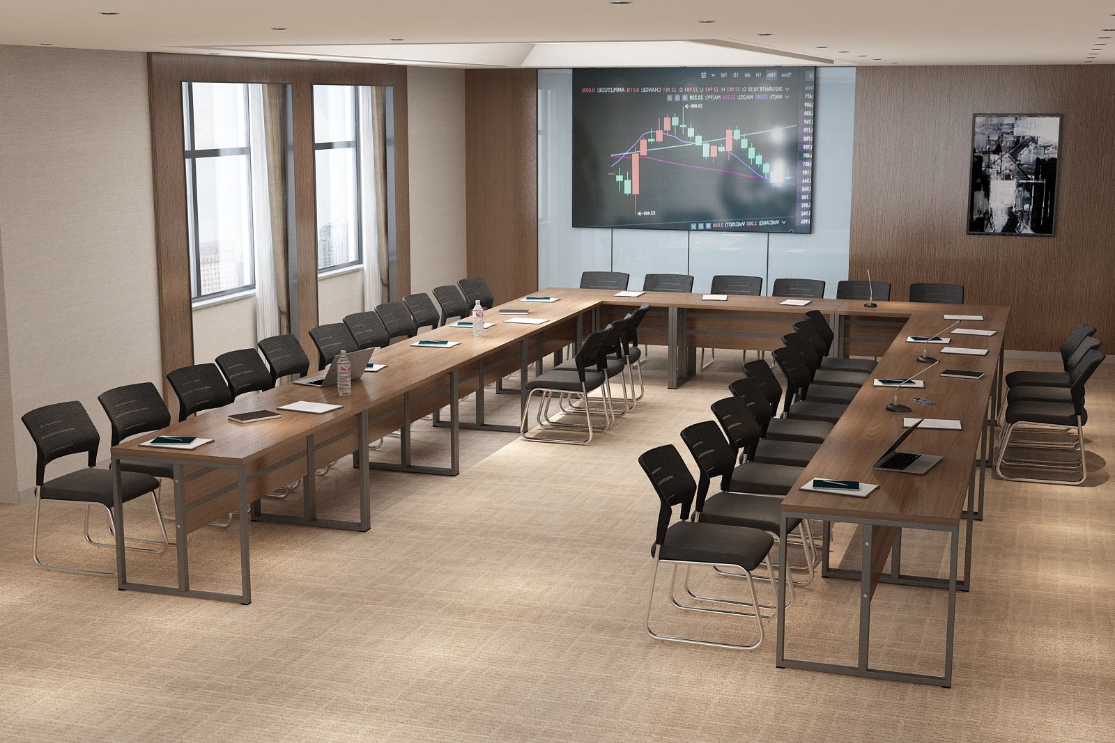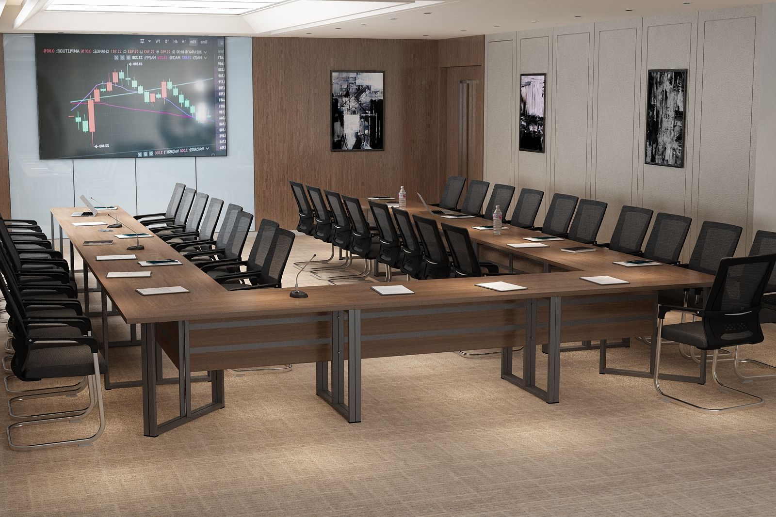Elegancki stelaż w połączeniu z minimalistyczną bryłą blatu ze ściętymi krawędziami nadaje wnętrzu profesjonalny i prestiżowy charakter, doskonale integrując się z różnymi stylami aranżacji.
