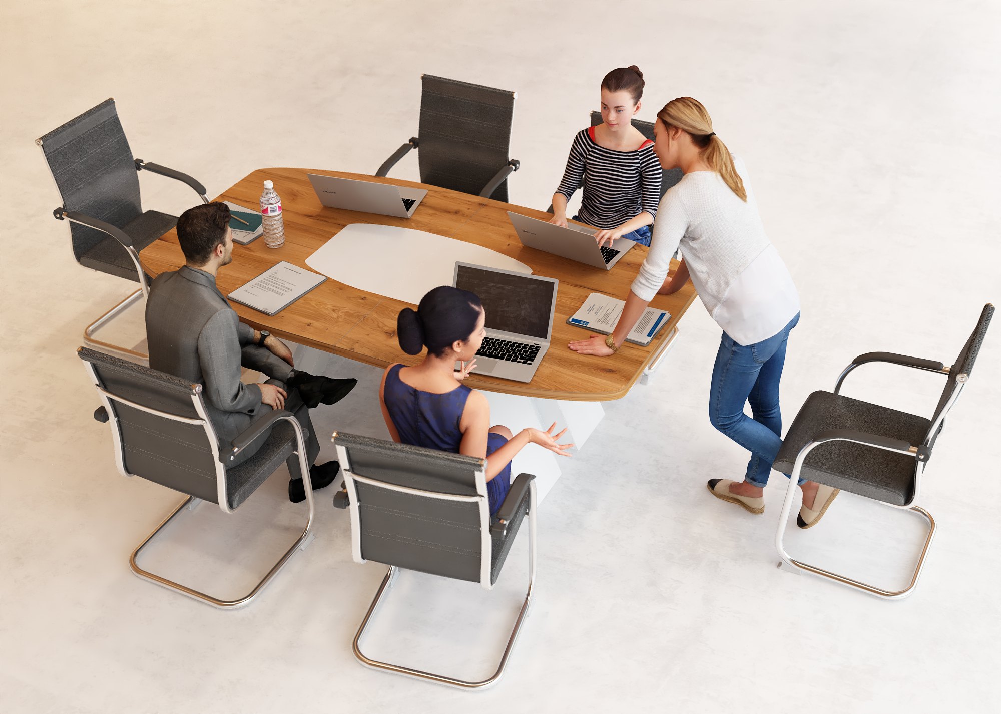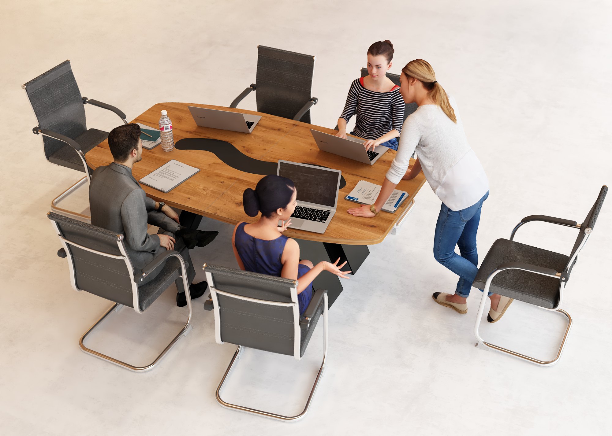 • Funkcjonalność: Dzięki opcjonalnym gniazdkom i systemowi zarządzania kablami, spotkania są płynne i estetyczne.