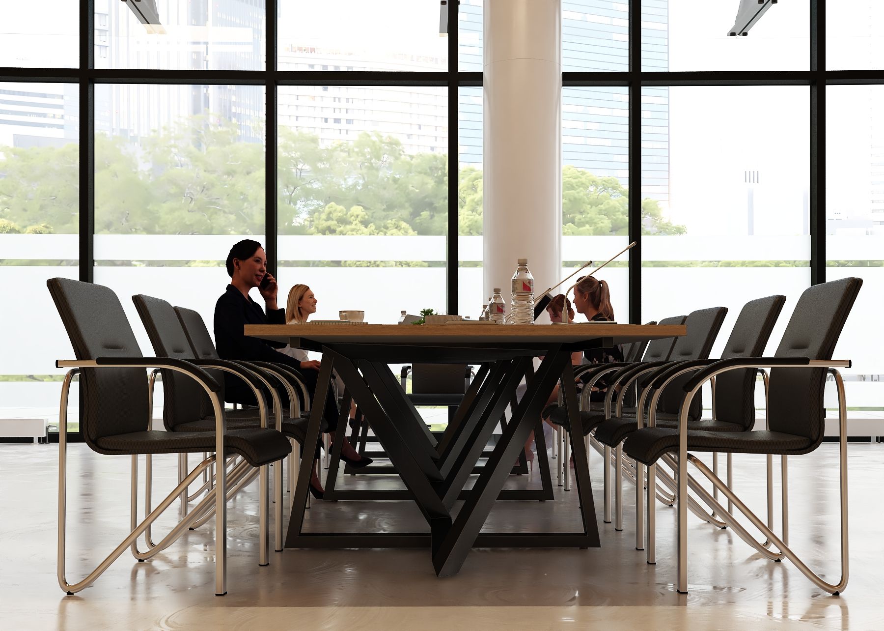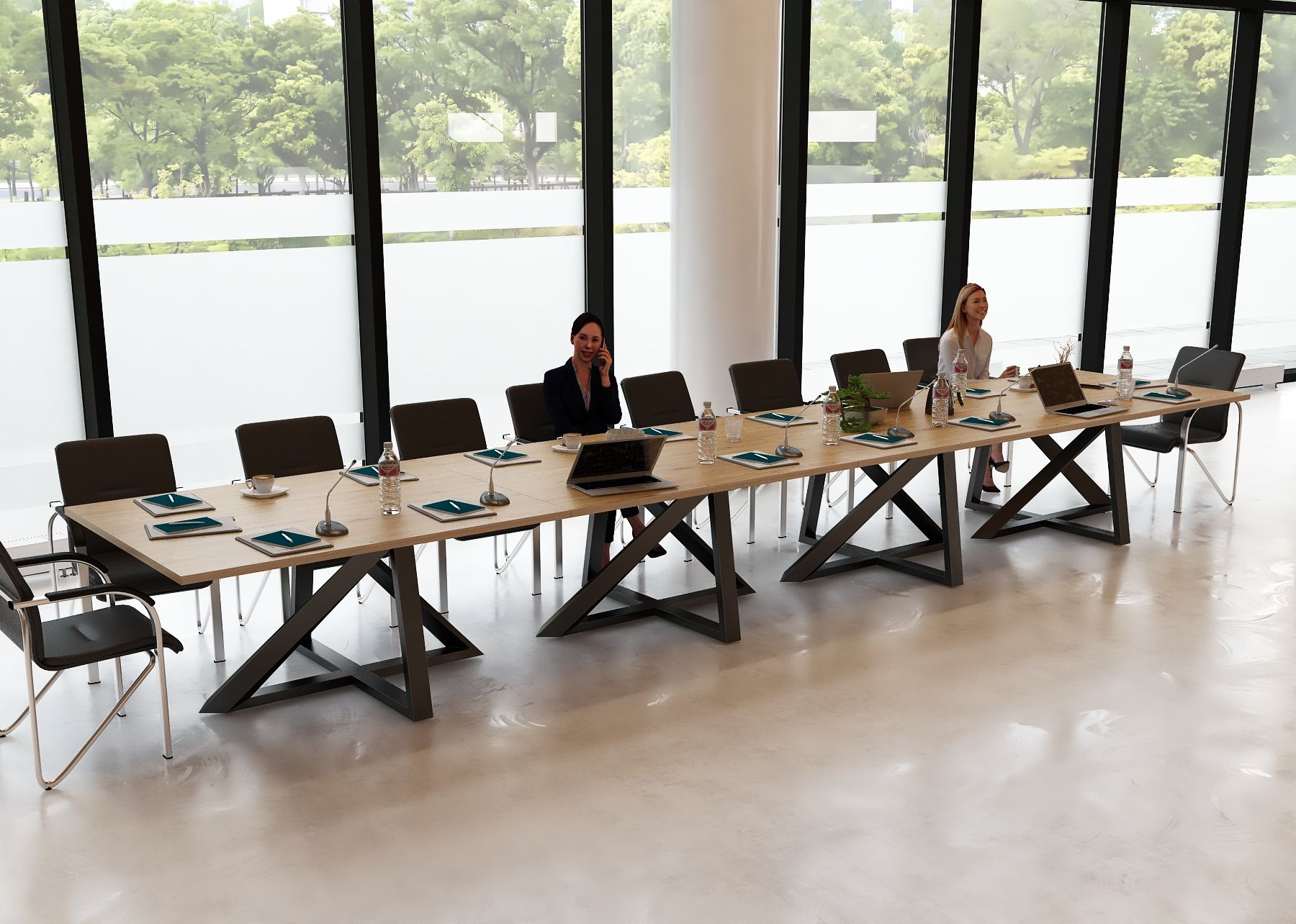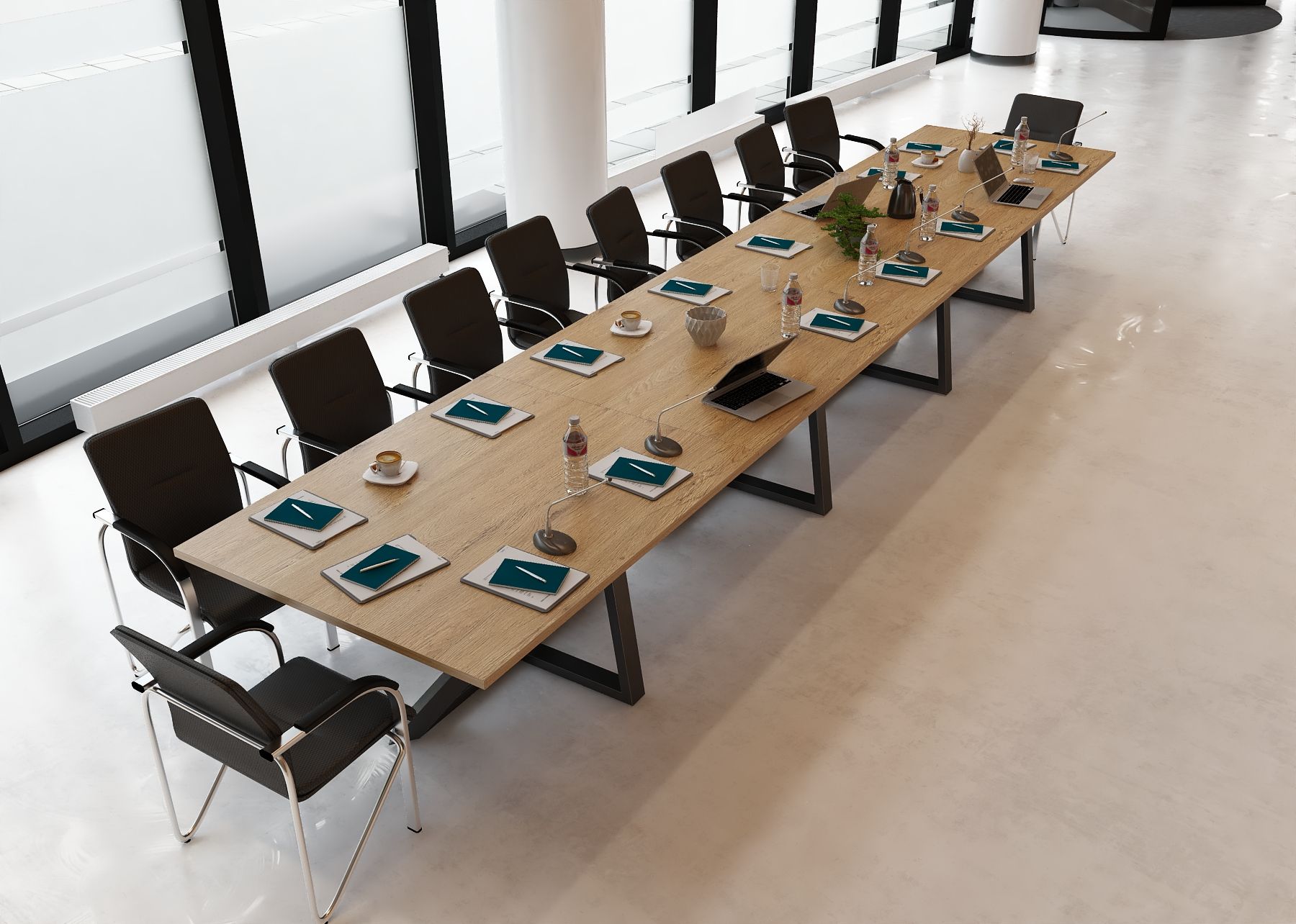 Stół został zaprojektowany z myślą o komfortowej pracy i spotkaniach w gronie około 22 osób. Ostateczna liczba miejsc siedzących zależy jednak od wielkości oraz rodzaju użytych krzeseł – w przypadku smuklejszych modeli przy stole może usiąść nawet nieco więcej osób, natomiast szersze, masywniejsze fotele konferencyjne mogą zmniejszyć liczbę dostępnych miejsc. Dzięki temu stół można łatwo dopasować do indywidualnych potrzeb i charakteru przestrzeni biurowej.