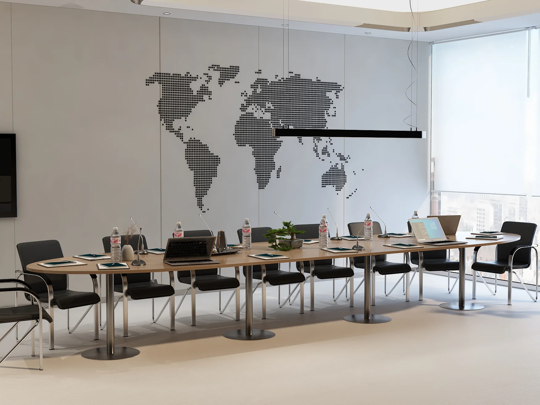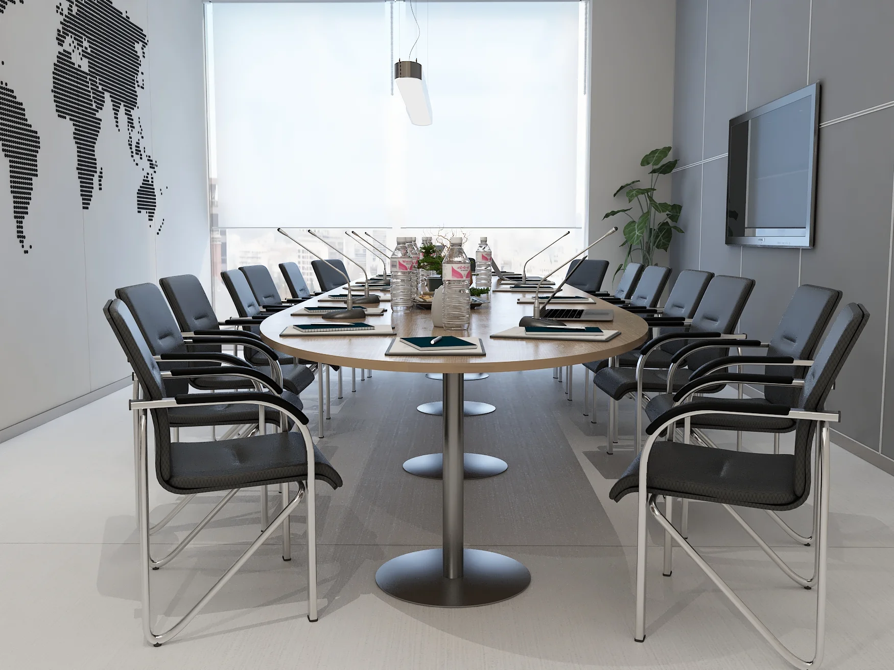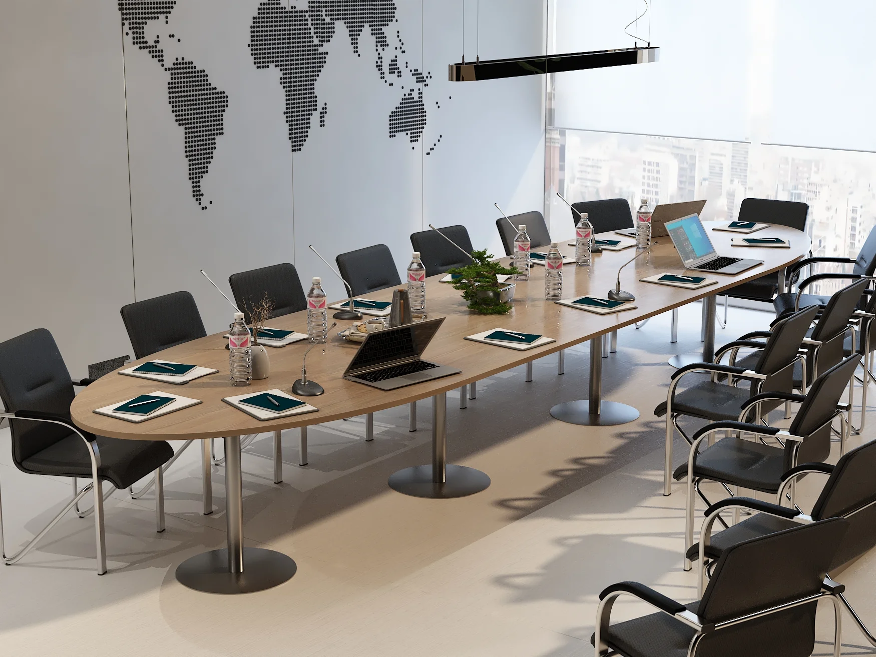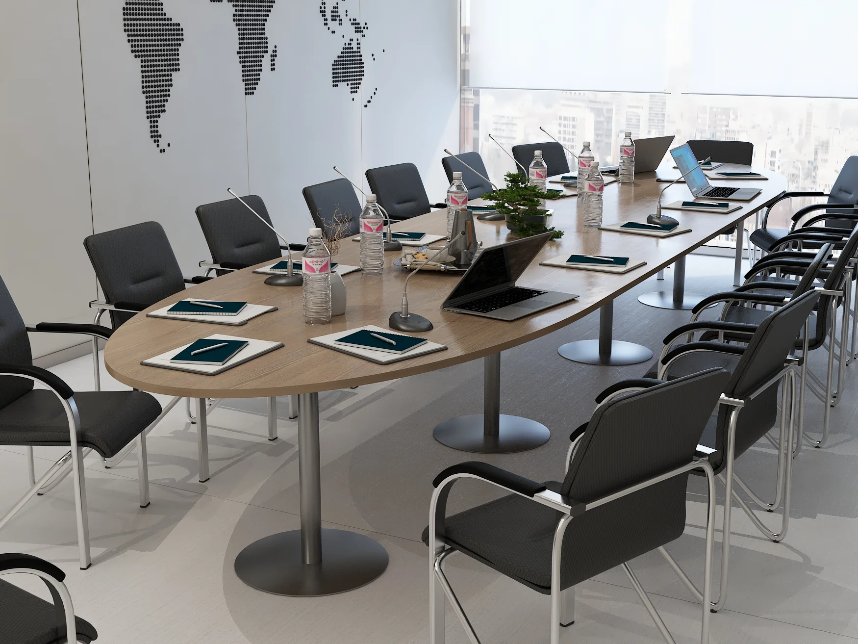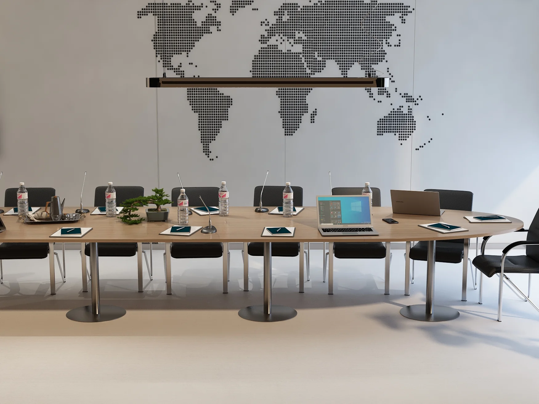 • Metalowy stelaż o nowoczesnej konstrukcji gwarantuje doskonałą stabilność i wyrazisty, współczesny design. Dzięki minimalistycznej, eleganckiej formie świetnie dopasowuje się do blatów w różnych kolorach, umożliwiając stworzenie spójnej i estetycznej aranżacji sali konferencyjnej.