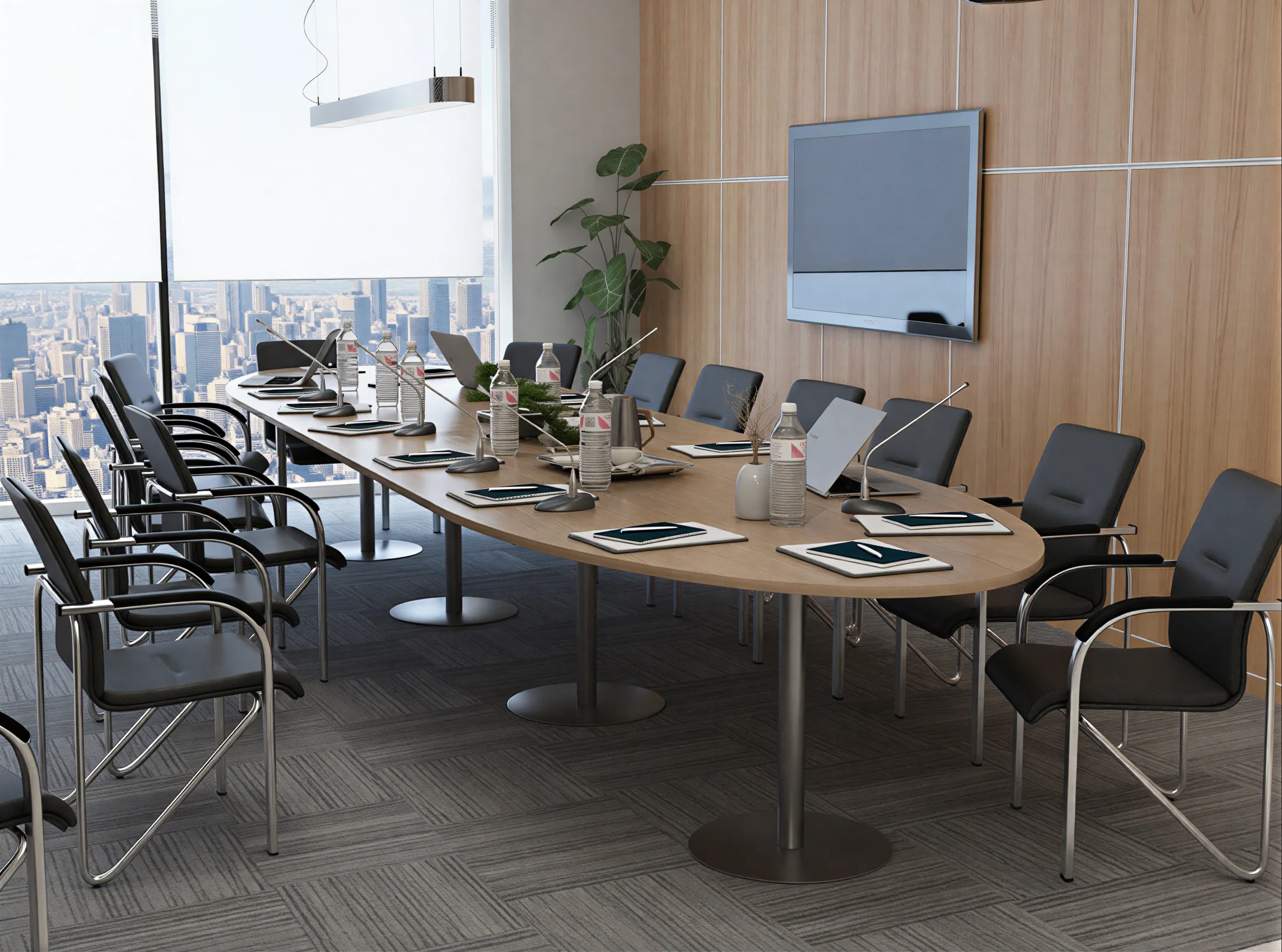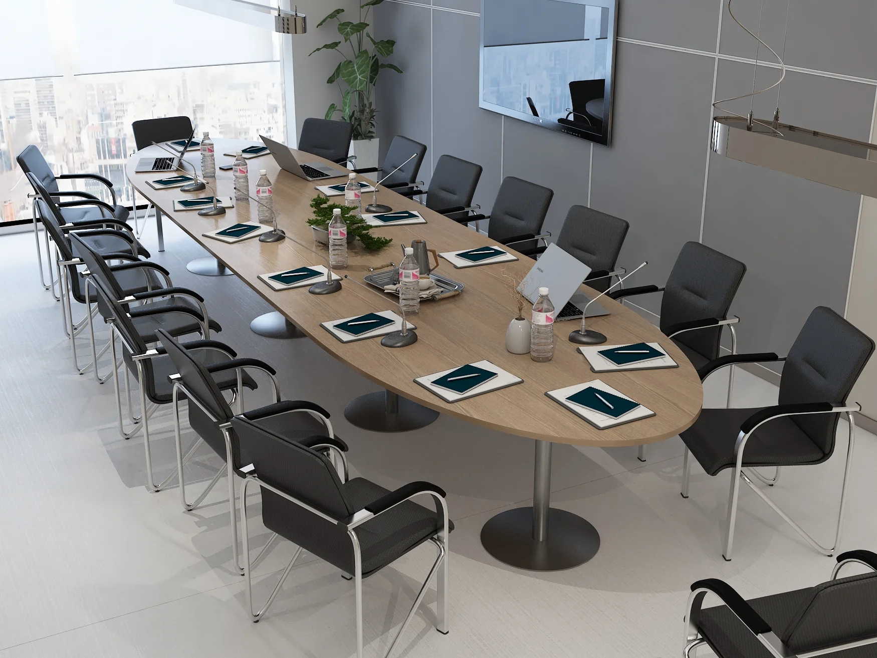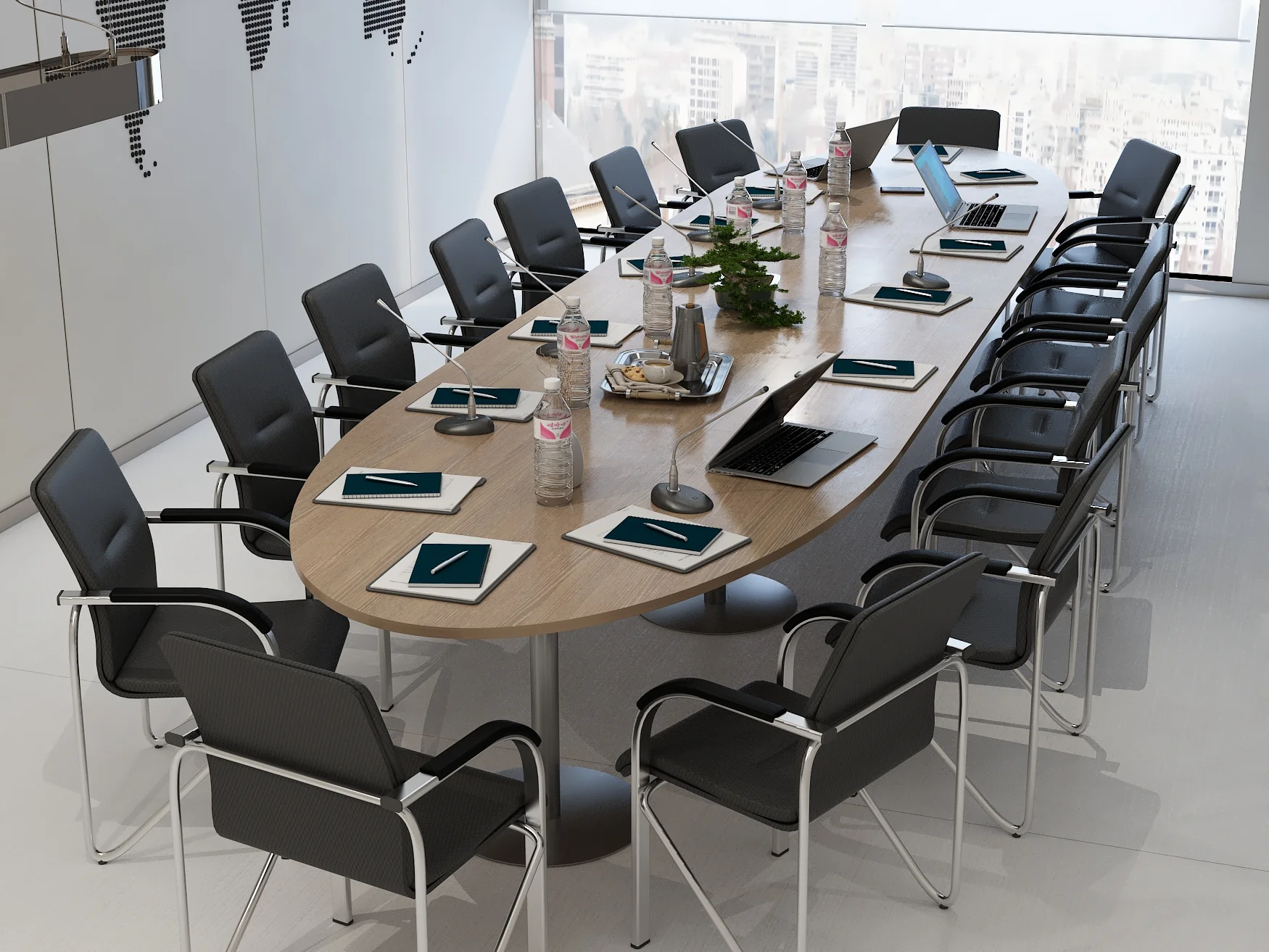 Stół ma kształt wydłużonego owalu (tzw. racetrack / stadium shape), co pozwala zachować dobry kontakt wzrokowy.