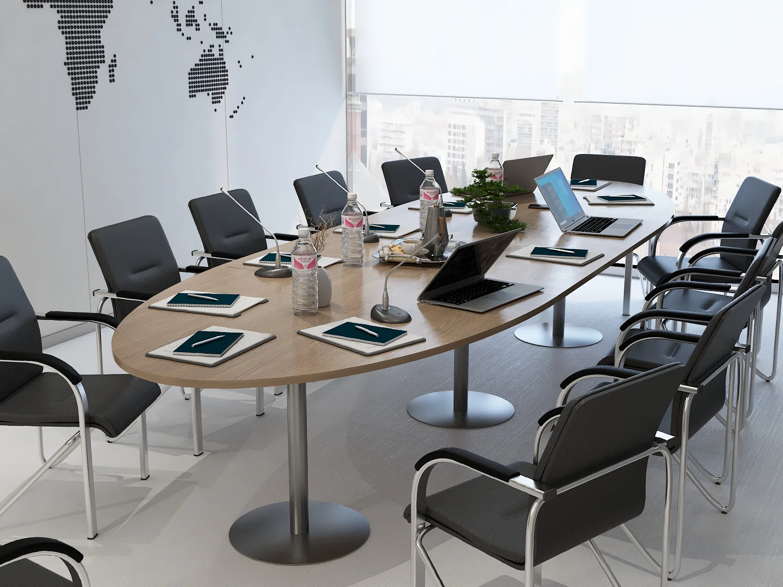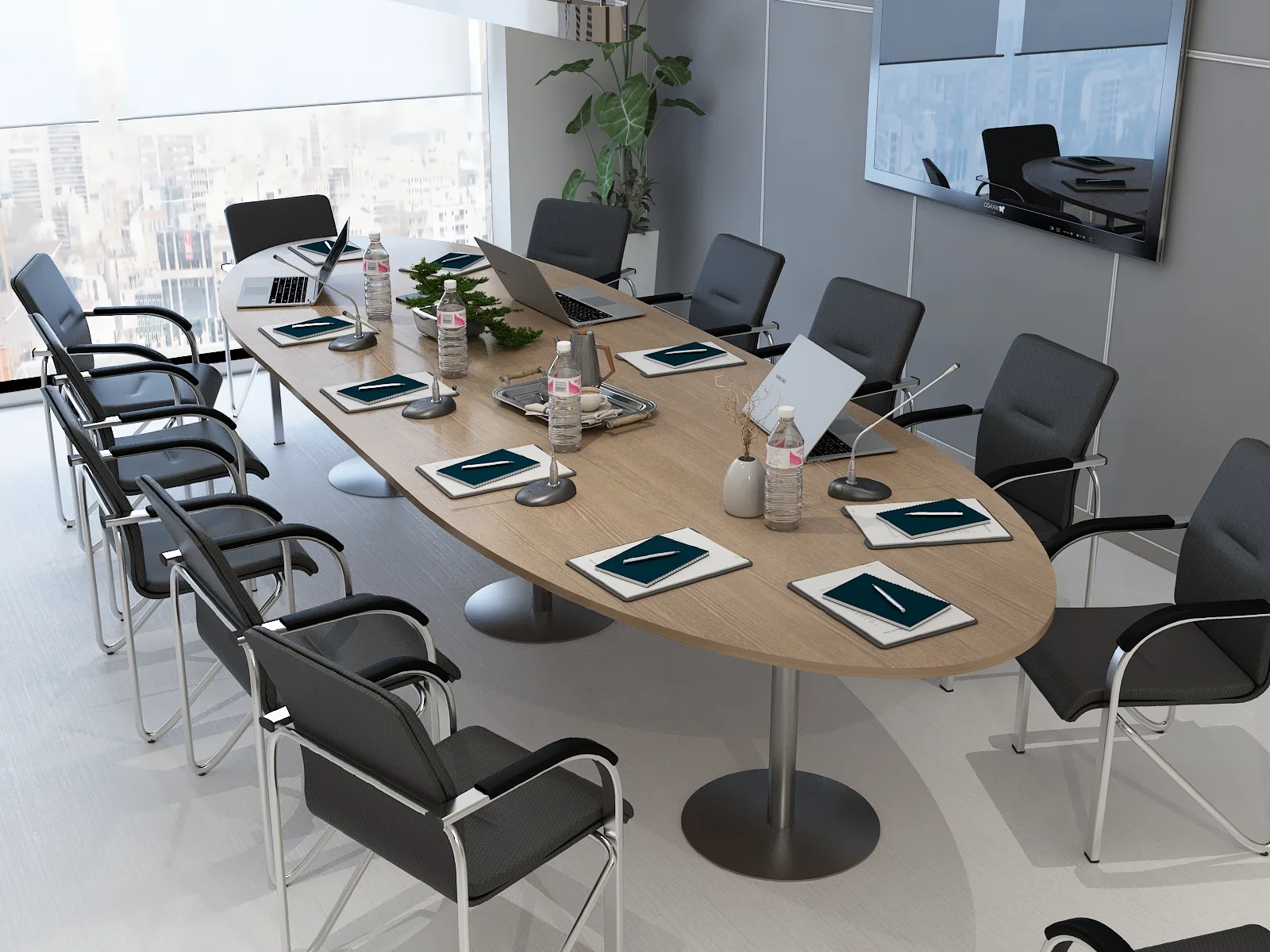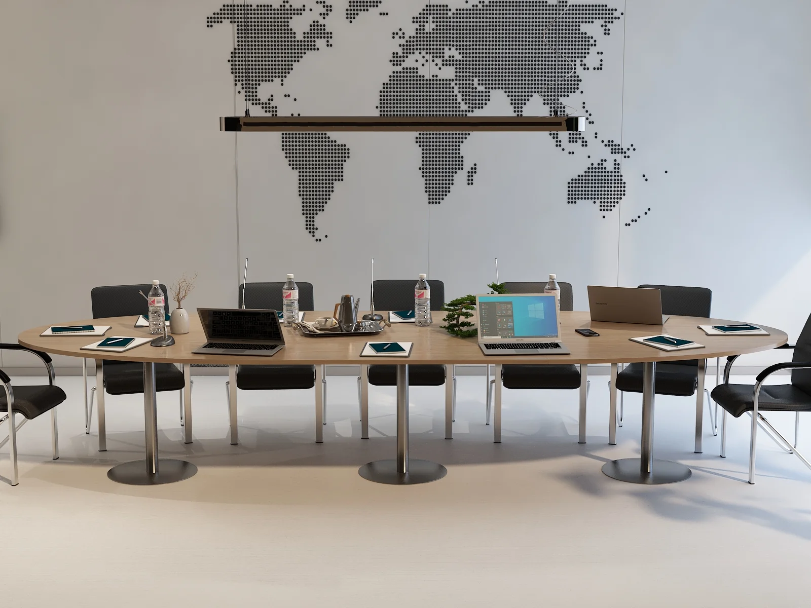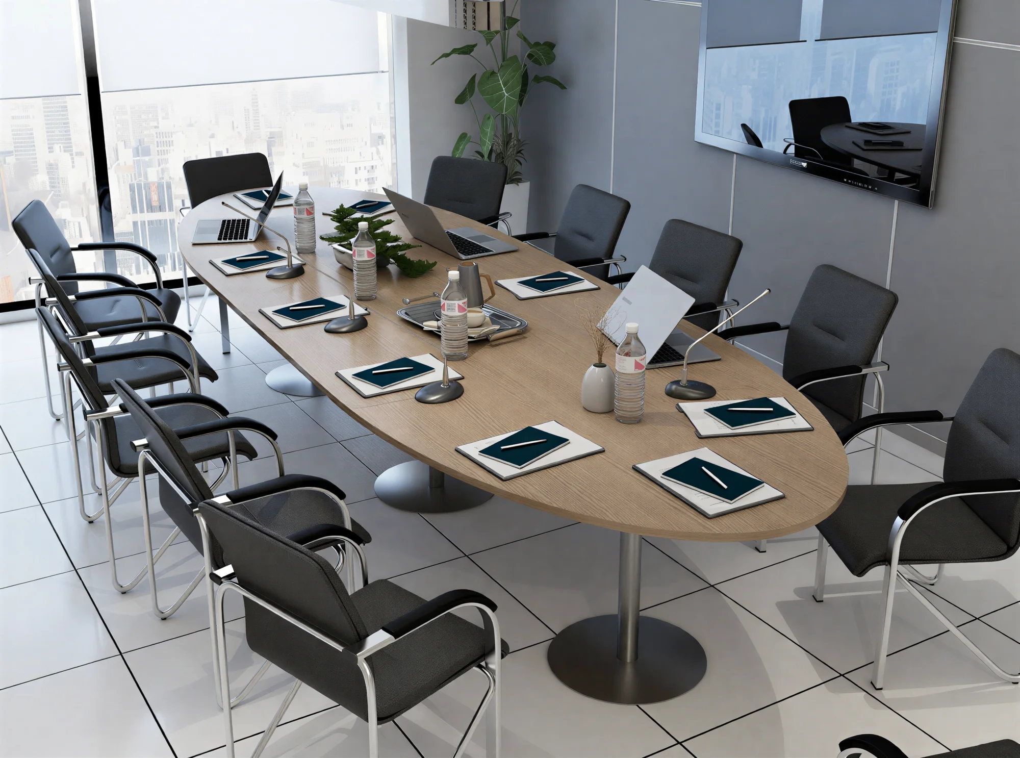 Stół ma kształt wydłużonego owalu (tzw. racetrack / stadium shape), co pozwala zachować dobry kontakt wzrokowy.