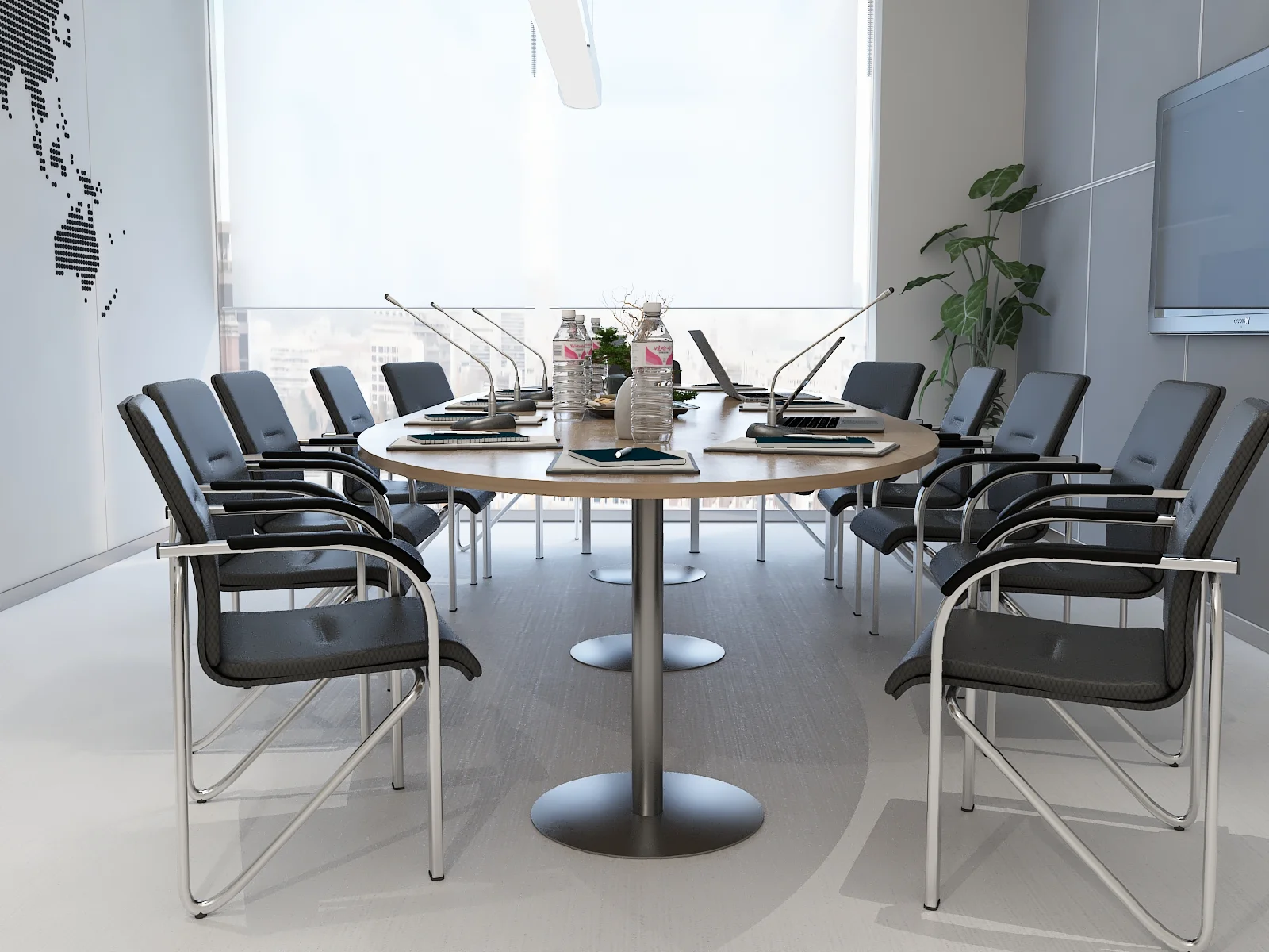 • Metalowy stelaż o nowoczesnej konstrukcji gwarantuje doskonałą stabilność i wyrazisty, współczesny design. Dzięki minimalistycznej, eleganckiej formie świetnie dopasowuje się do blatów w różnych kolorach, umożliwiając stworzenie spójnej i estetycznej aranżacji sali konferencyjnej.