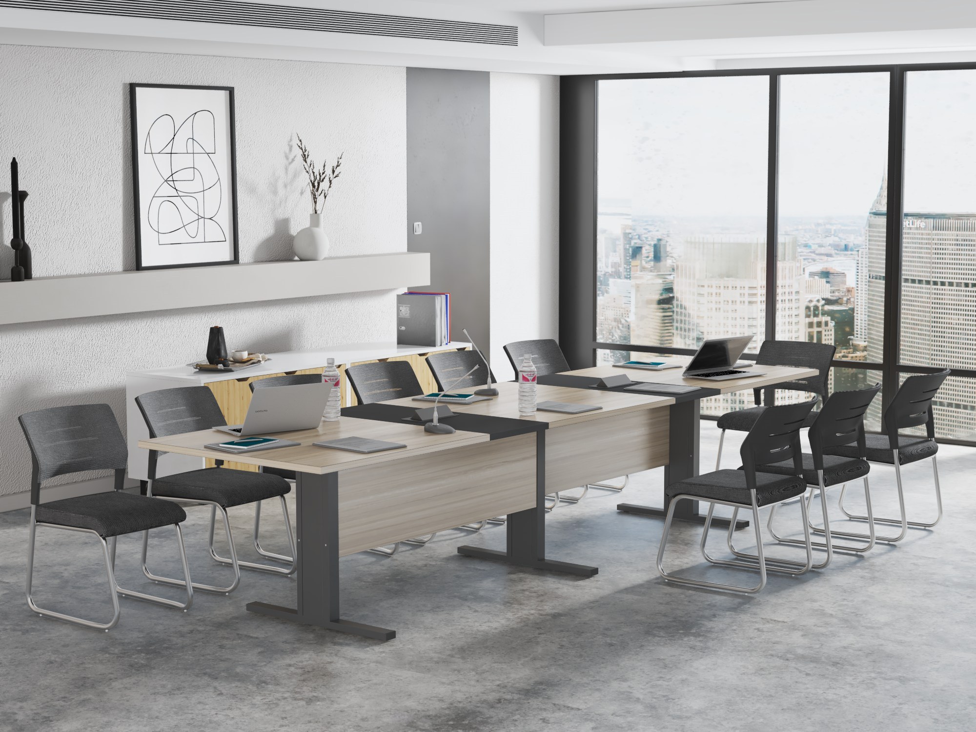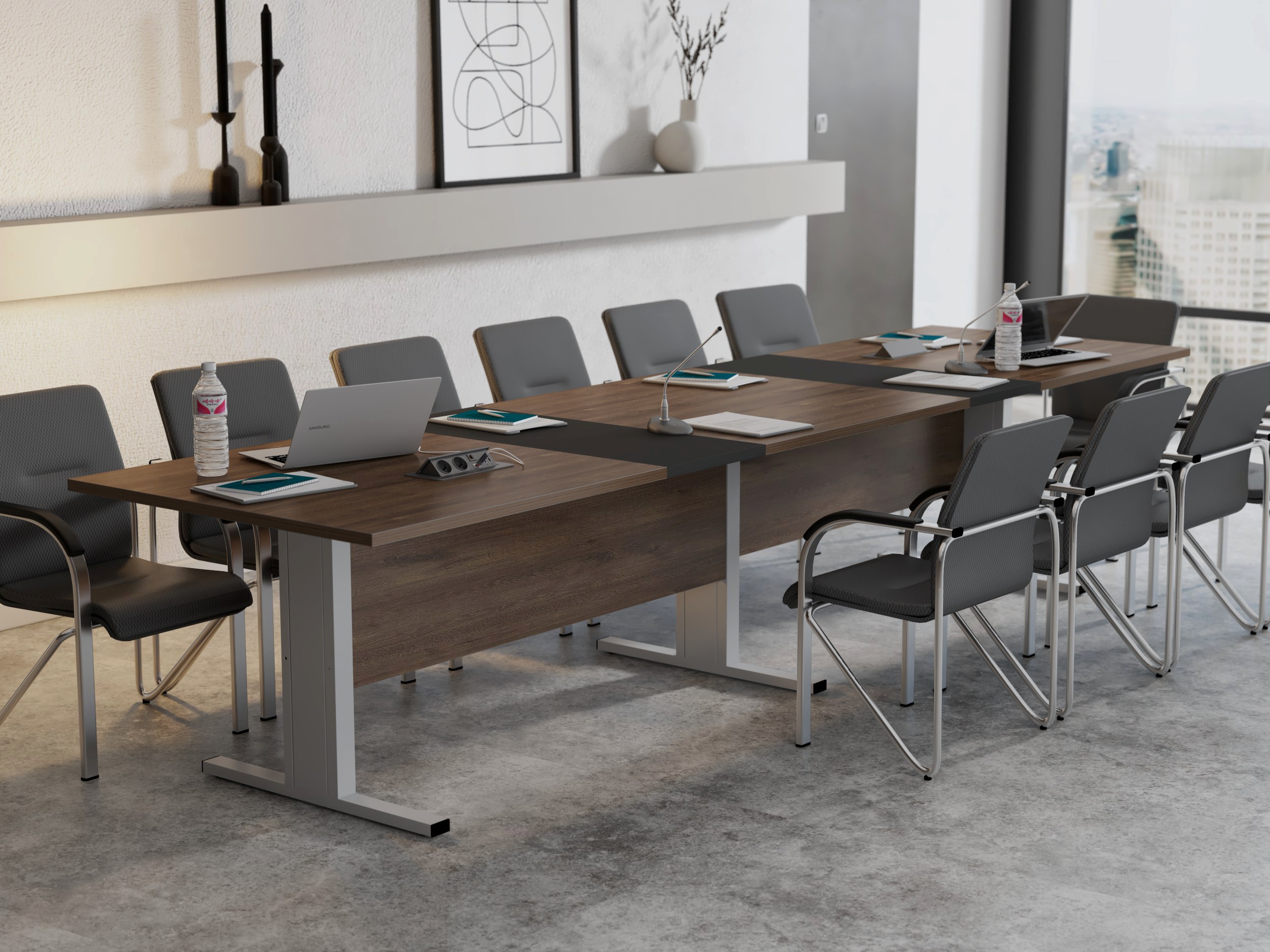 - Metalowa, konstrukcja w formie Litery T gwarantuje doskonałą stabilność stołu, a jej minimalistyczny projekt elegancko prezentuje się w każdej sali konferencyjnej.
