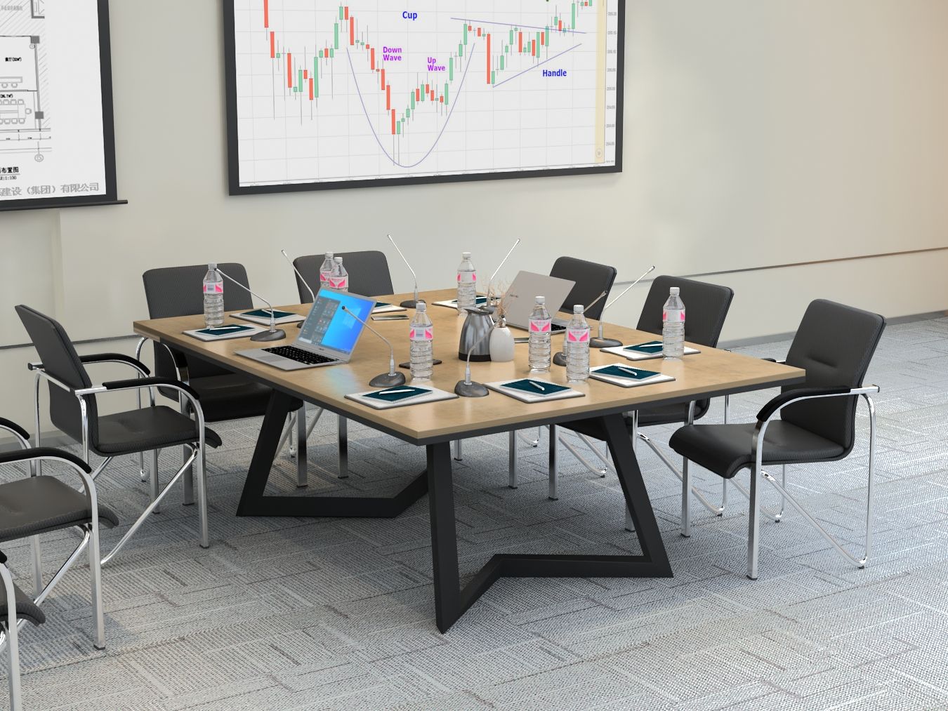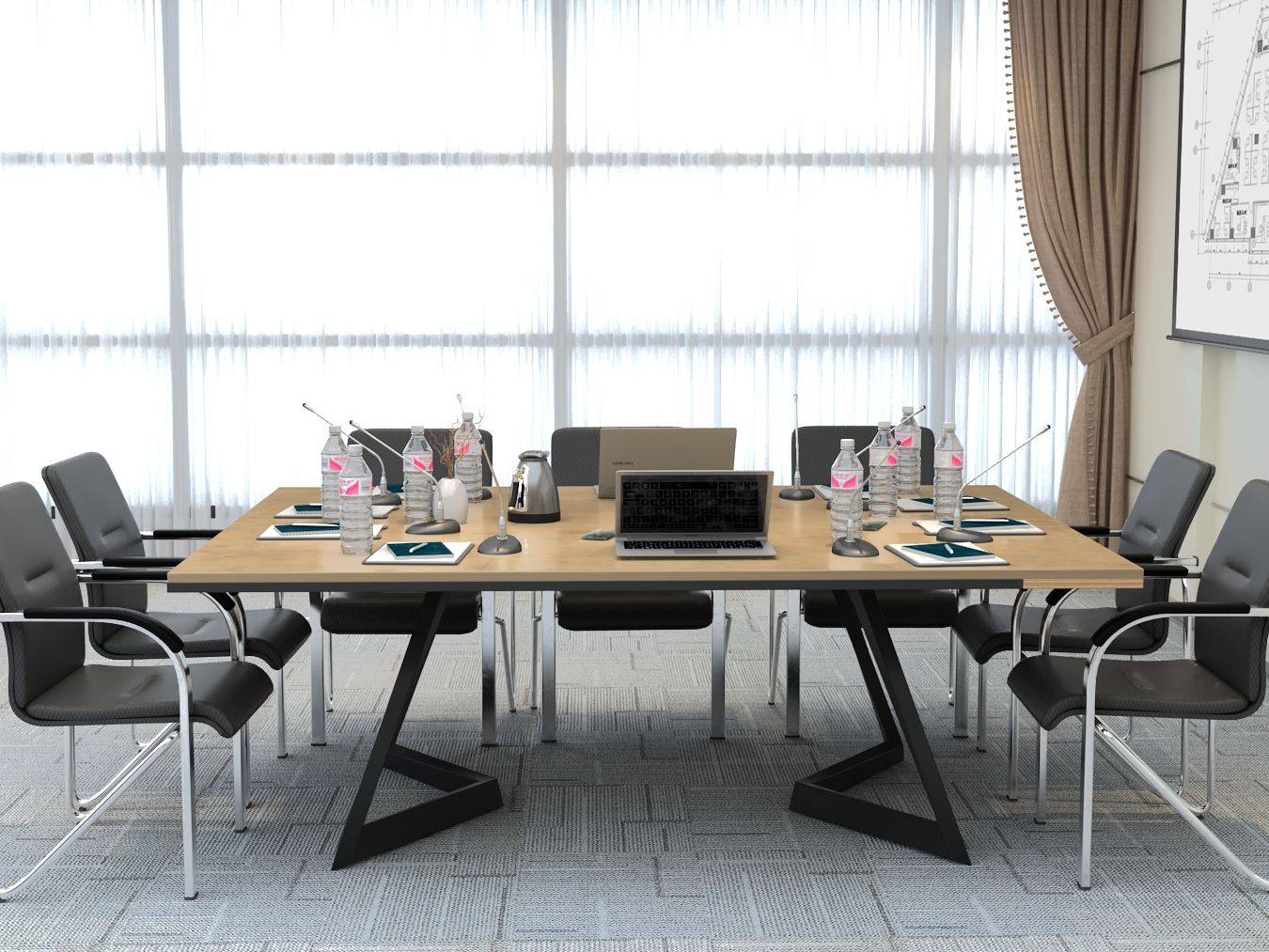 - Stelaż stołu konferencyjnego wykonany jest metalowych profili w geometrycznym strzałkowym kształcie , tworzących stabilną, krzyżową konstrukcję nośną.