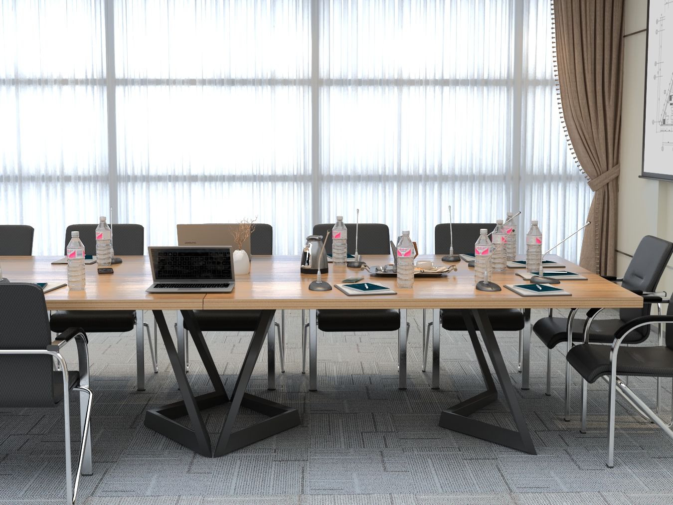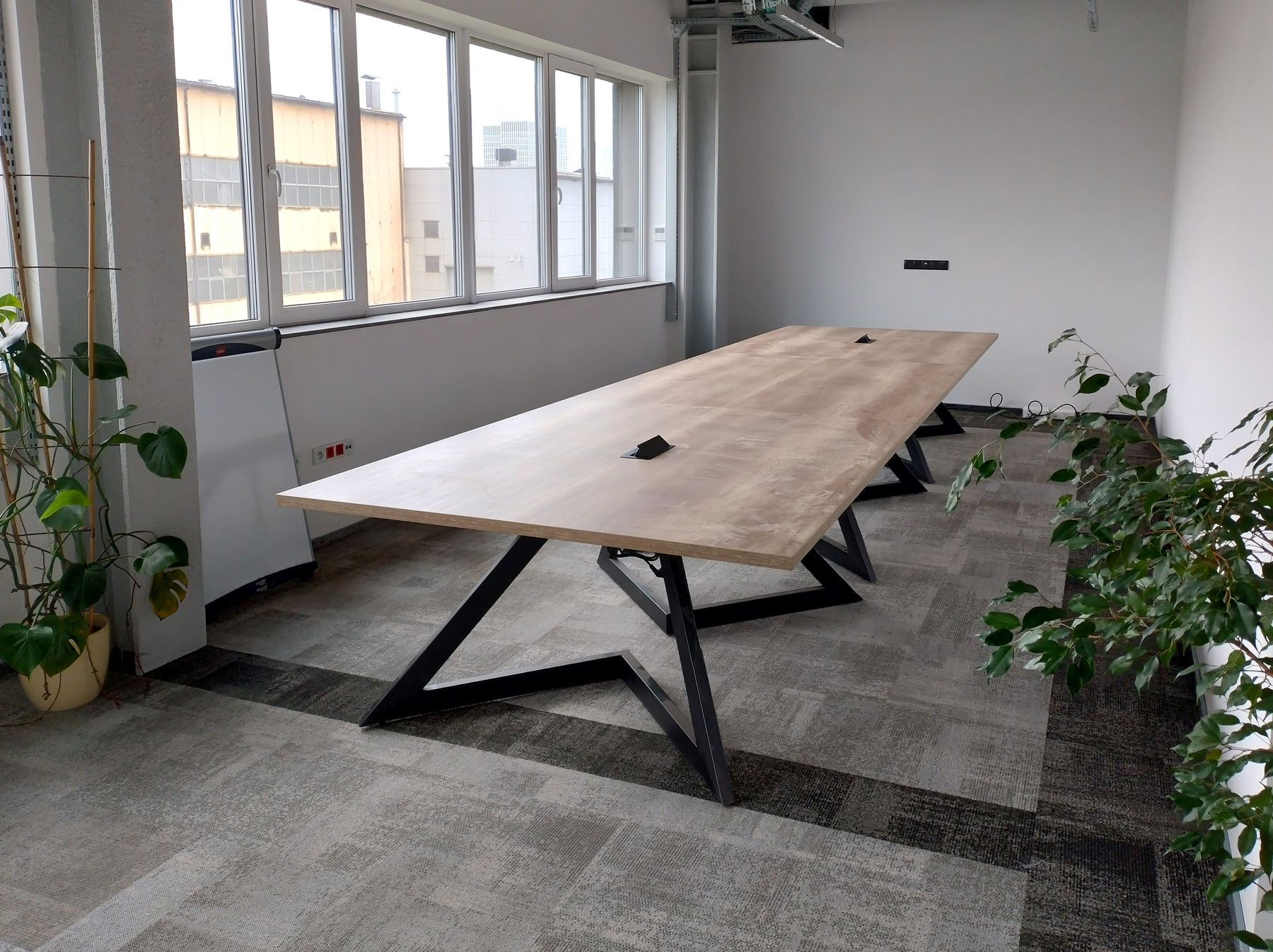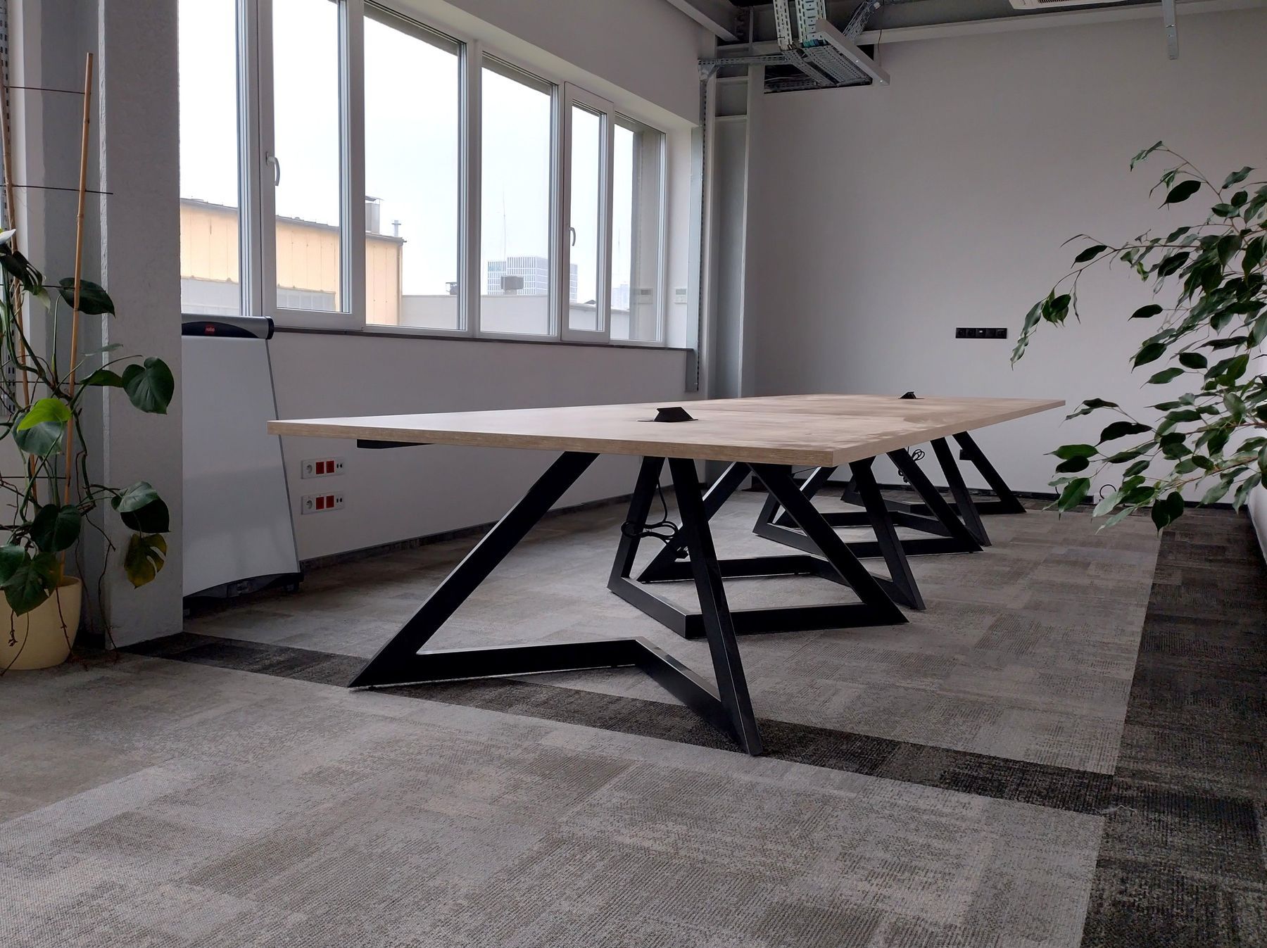 - Stelaż stołu konferencyjnego wykonany jest metalowych profili w geometrycznym strzałkowym kształcie , tworzących stabilną, krzyżową konstrukcję nośną.