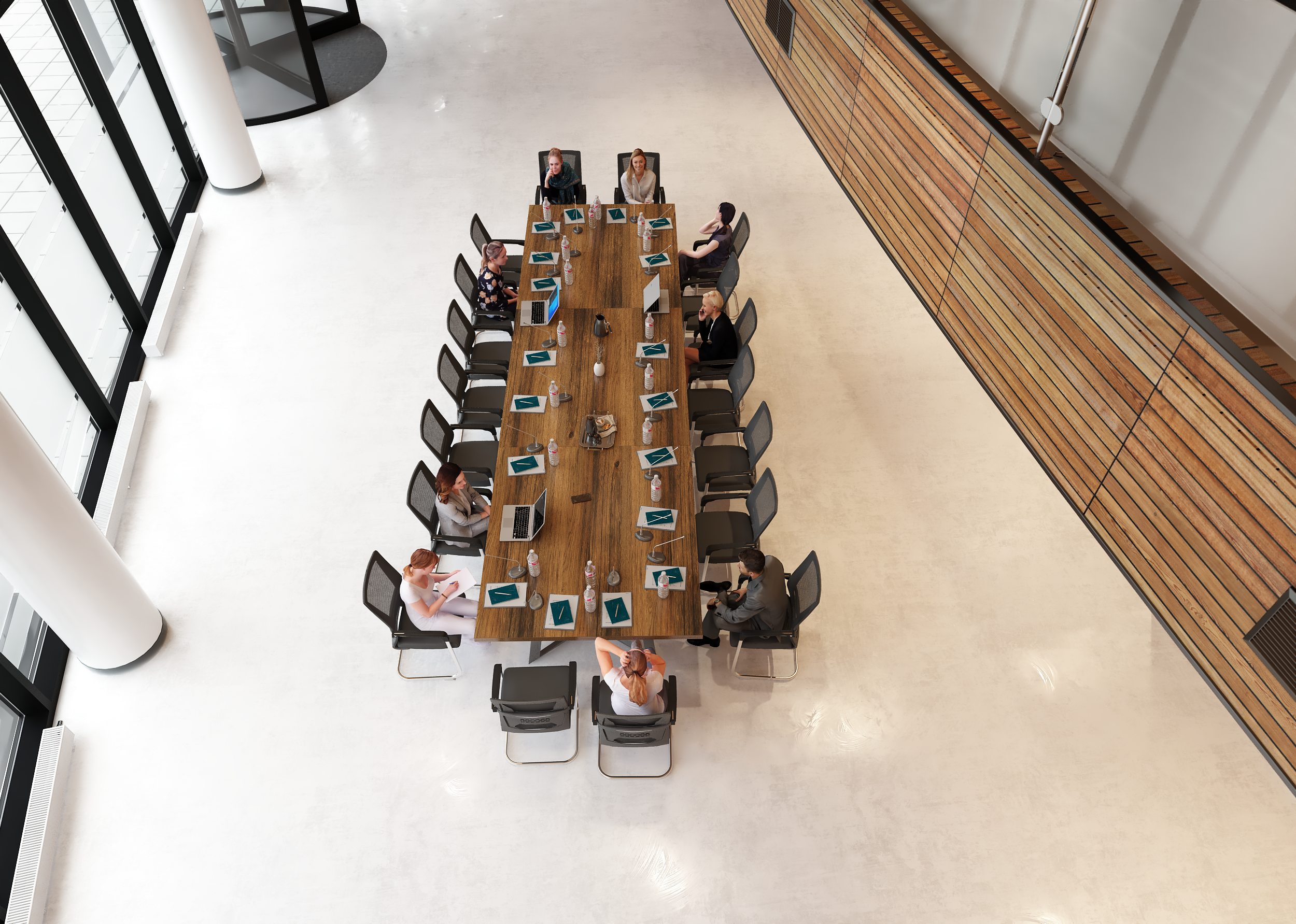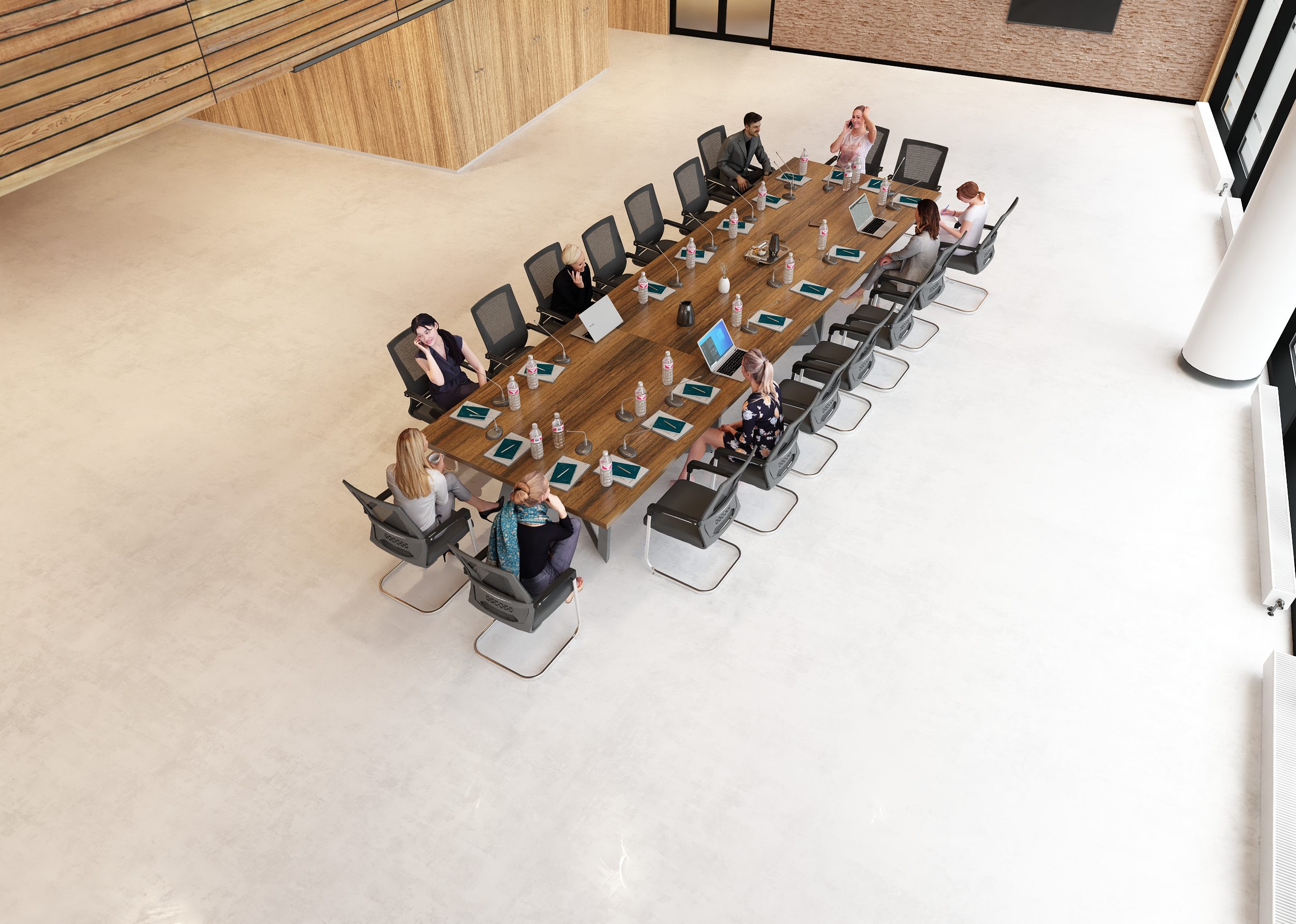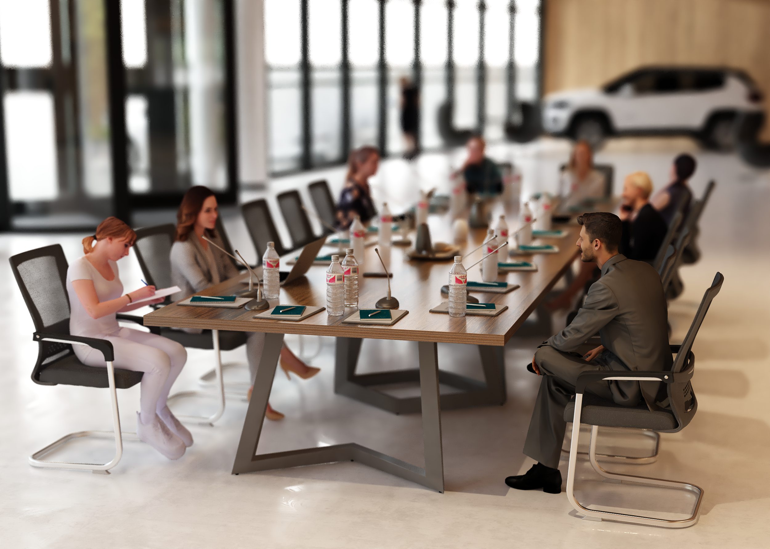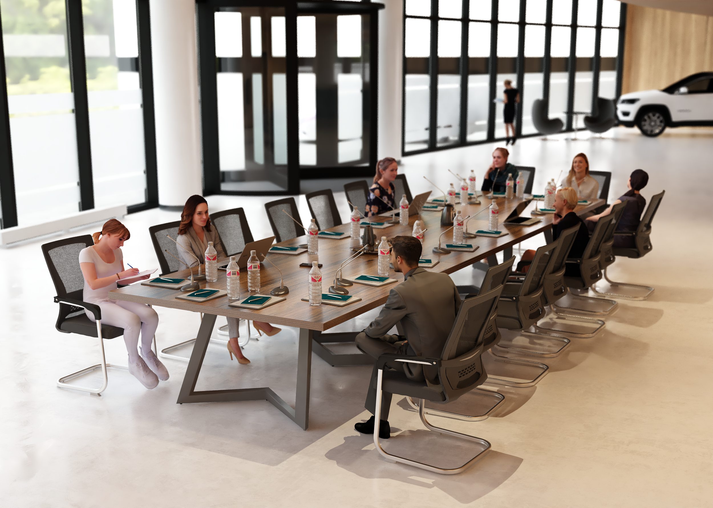 Stół został zaprojektowany z myślą o komfortowej pracy i spotkaniach w gronie około 22 osóbach. Ostateczna liczba miejsc siedzących zależy jednak od wielkości oraz rodzaju użytych krzeseł – w przypadku smuklejszych modeli przy stole może usiąść nawet nieco więcej osób, natomiast szersze, masywniejsze fotele konferencyjne mogą zmniejszyć liczbę dostępnych miejsc. Dzięki temu stół można łatwo dopasować do indywidualnych potrzeb i charakteru przestrzeni biurowej.