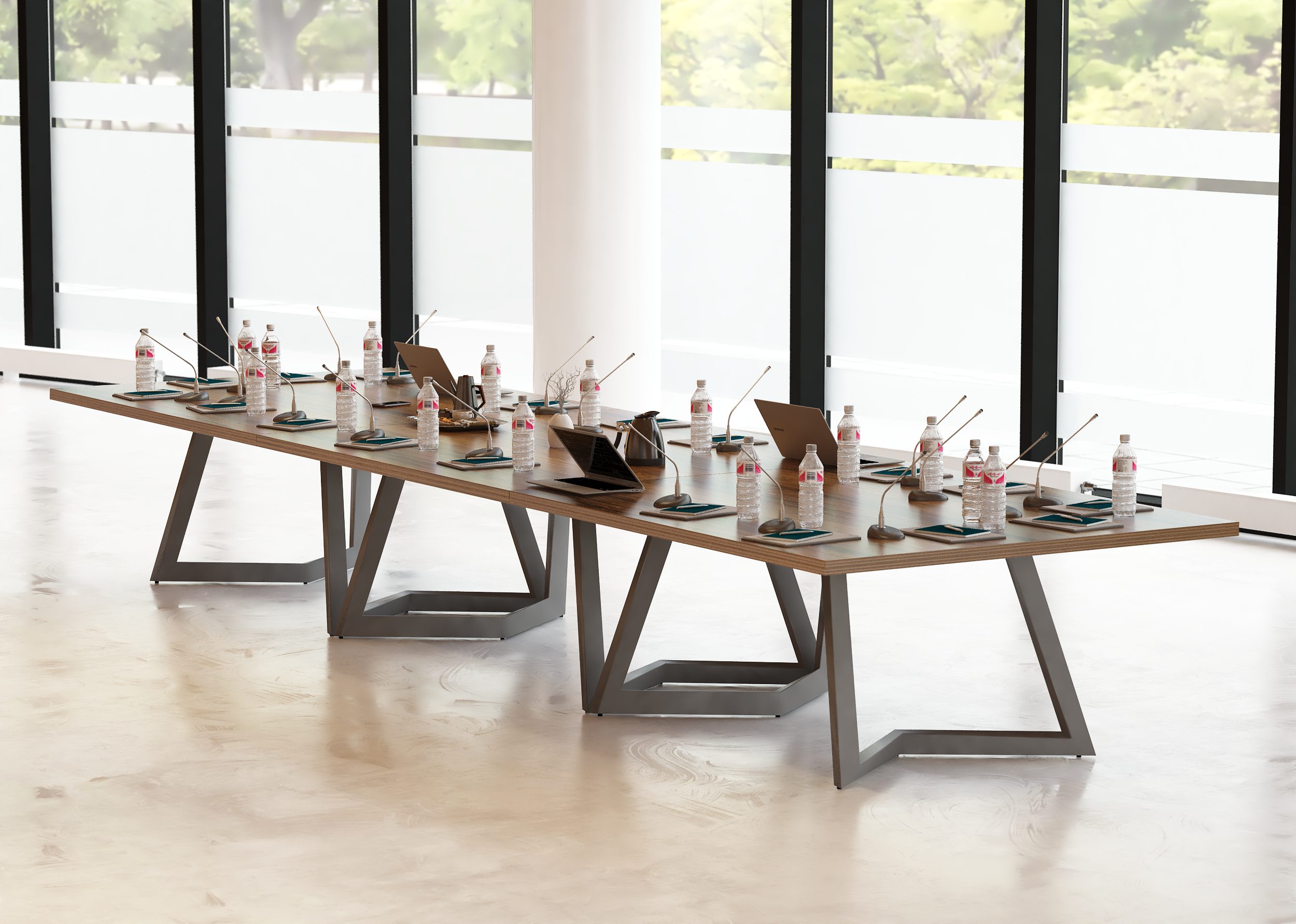 - Stelaż stołu konferencyjnego wykonany jest metalowych profili w geometrycznym strzałkowym kształcie , tworzących stabilną, krzyżową konstrukcję nośną.