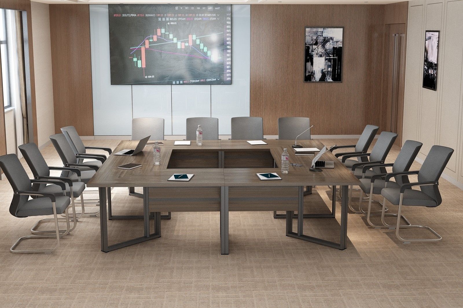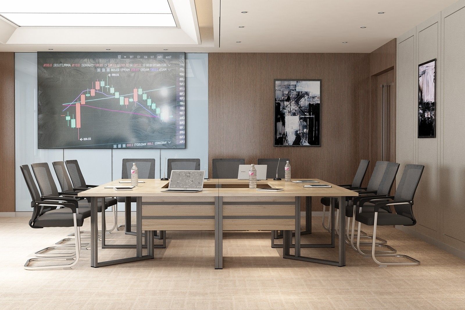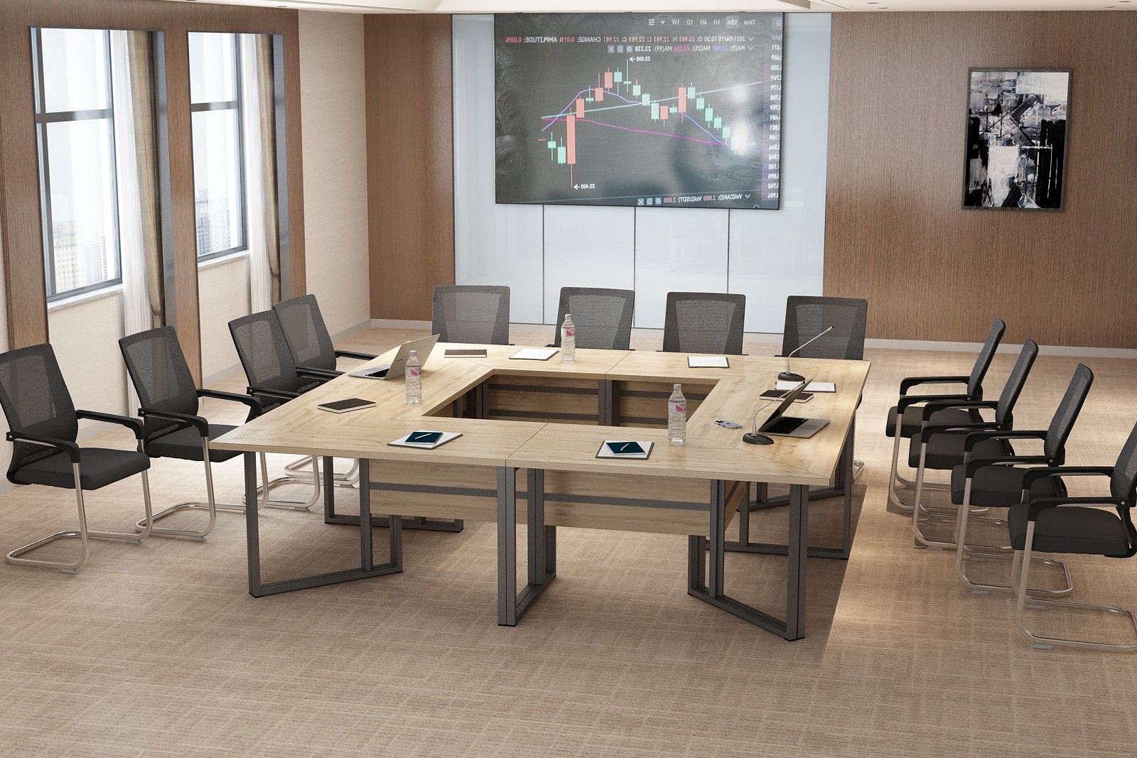 Elegancki stelaż w połączeniu z minimalistyczną bryłą blatu ze ściętymi krawędziami nadaje wnętrzu profesjonalny i prestiżowy charakter, doskonale integrując się z różnymi stylami aranżacji.