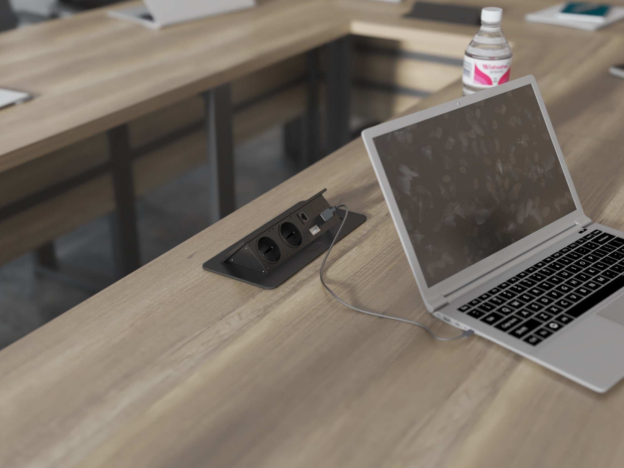 Dzięki wbudowanym portom medialnym i systemowi zarządzania kablami stół zapewnia maksymalny porządek i komfort.