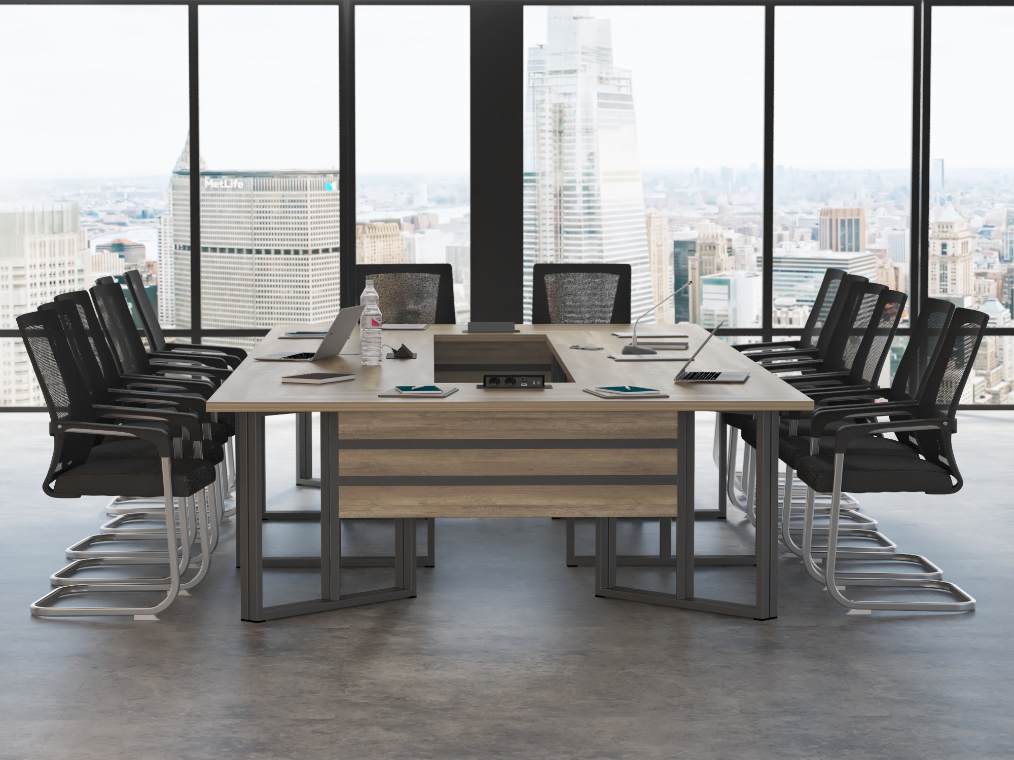 Opcjonalne wyposażenie, takie jak porty multimedialne i systemy do prowadzenia kabli, pomaga zachować porządek i podnosi komfort pracy podczas spotkań oraz prezentacji.