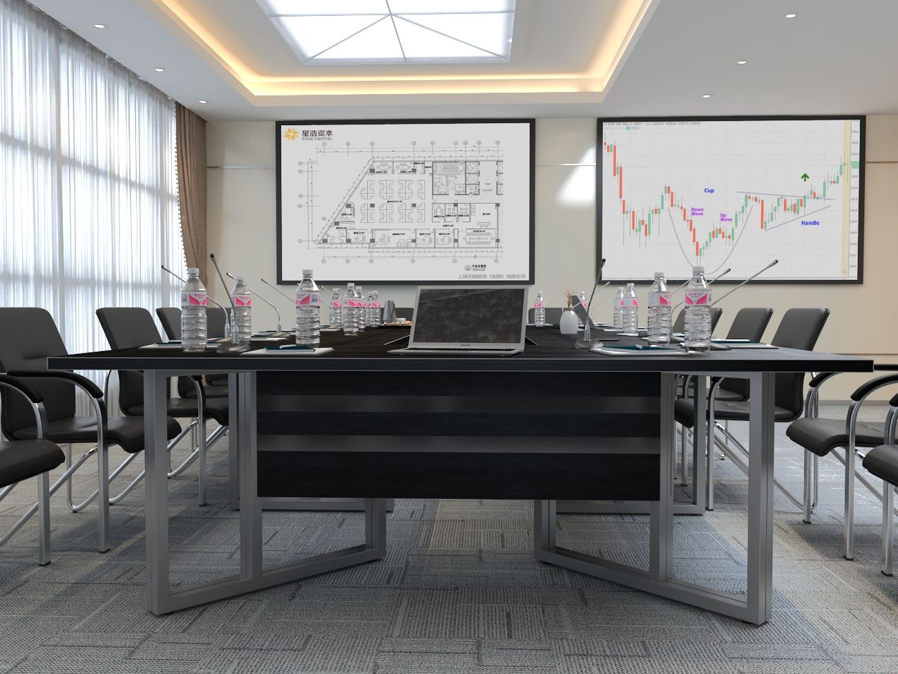 Elegancki stelaż w połączeniu z minimalistyczną bryłą blatu ze ściętymi krawędziami nadaje wnętrzu profesjonalny i prestiżowy charakter, doskonale integrując się z różnymi stylami aranżacji.