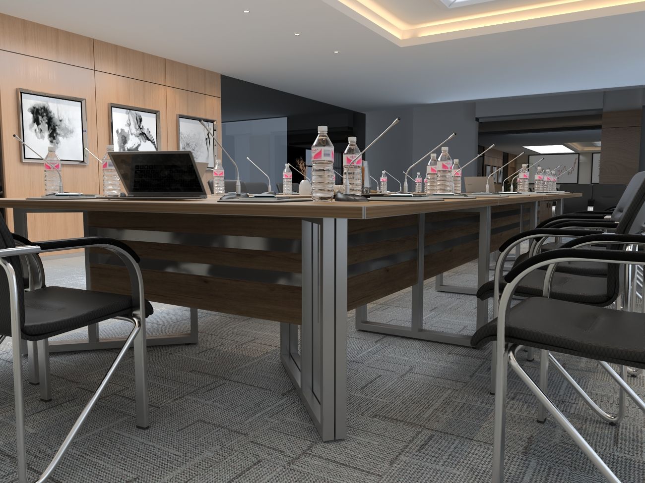 Elegancki stelaż w połączeniu z minimalistyczną bryłą blatu ze ściętymi krawędziami nadaje wnętrzu profesjonalny i prestiżowy charakter, doskonale integrując się z różnymi stylami aranżacji.
