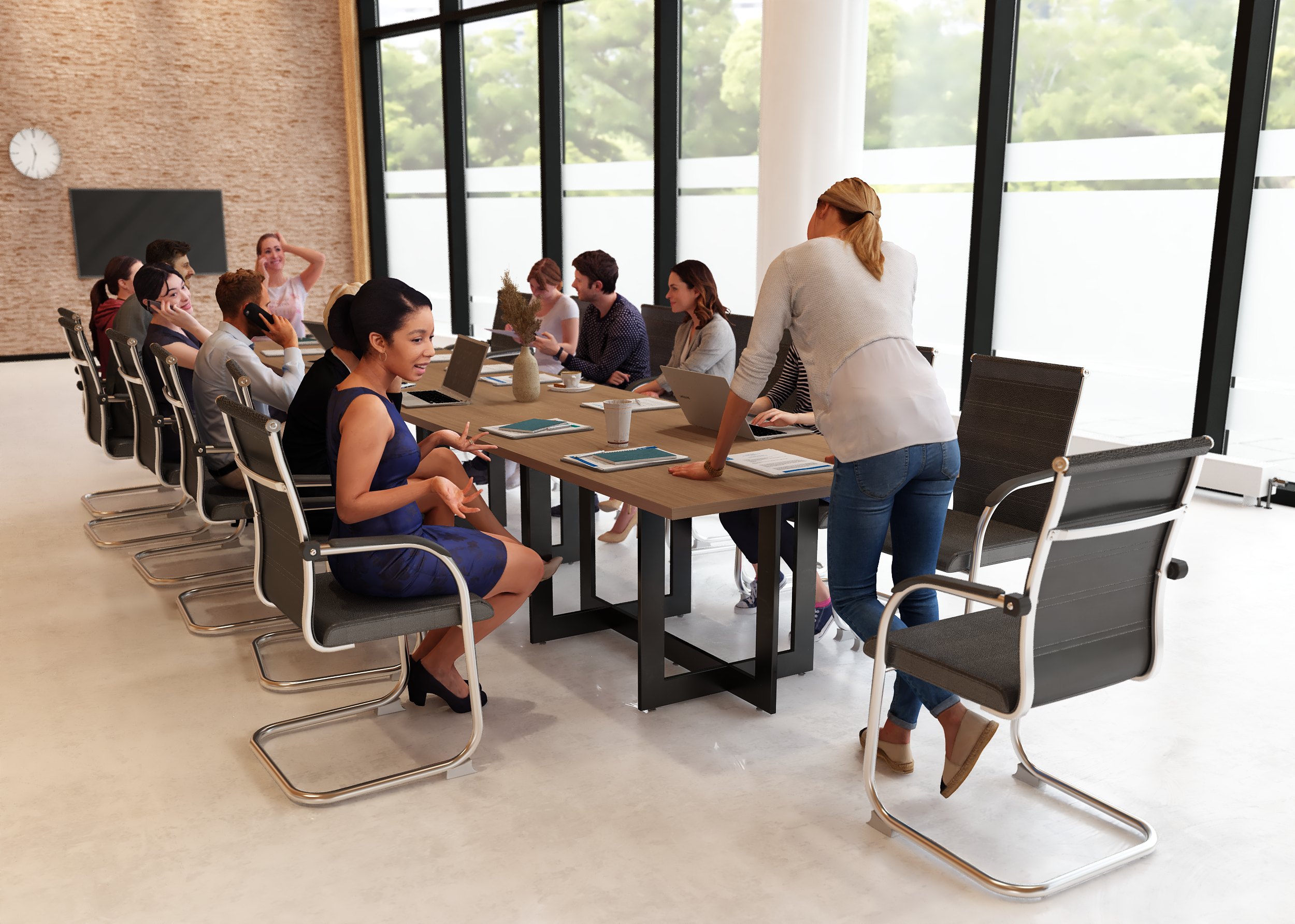 Elegancki stelaż w połączeniu z prostą bryłą blatu ze ściętymi rogami nadaje wnętrzu profesjonalny i prestiżowy charakter, doskonale wpasowując się w każde otoczenie.