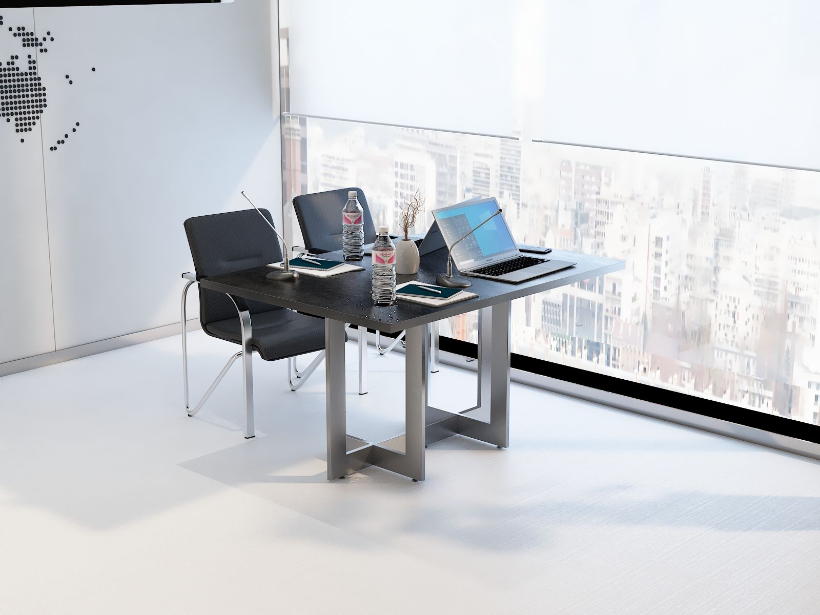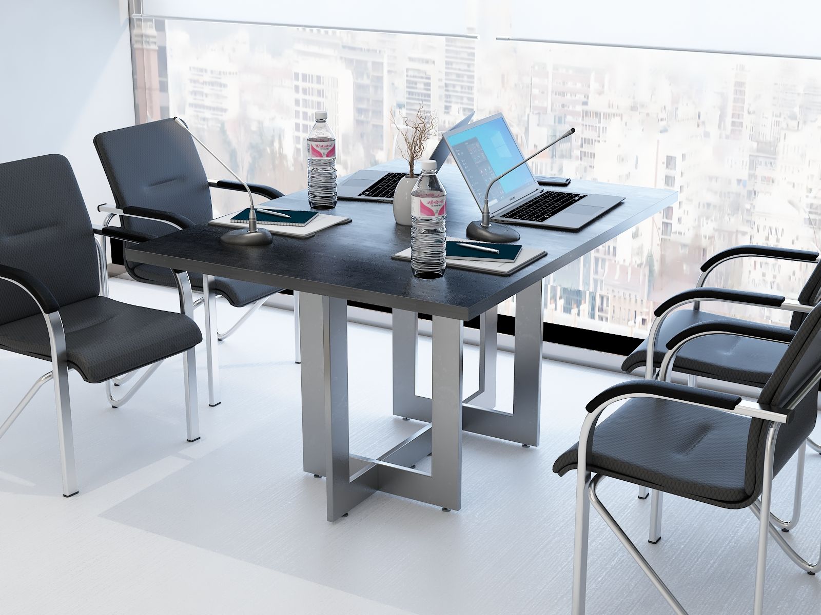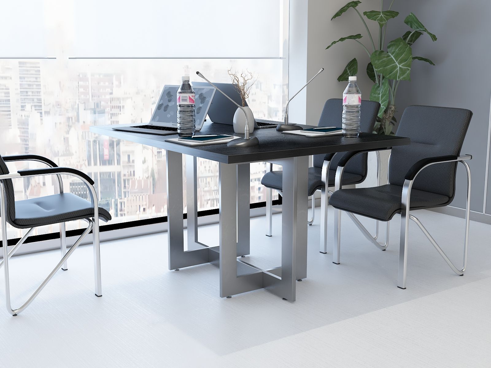 Elegancki stelaż w połączeniu z prostą bryłą blatu ze ściętymi rogami nadaje wnętrzu profesjonalny i prestiżowy charakter, doskonale wpasowując się w każde otoczenie.